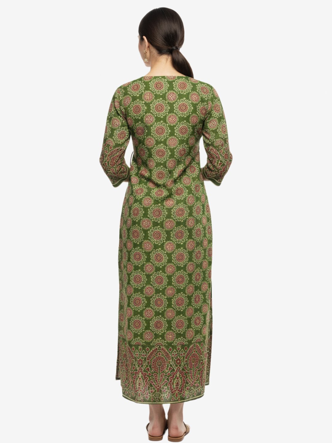 Green Printed Straight Fit Kurta with V-Neck & Tassel Detail
