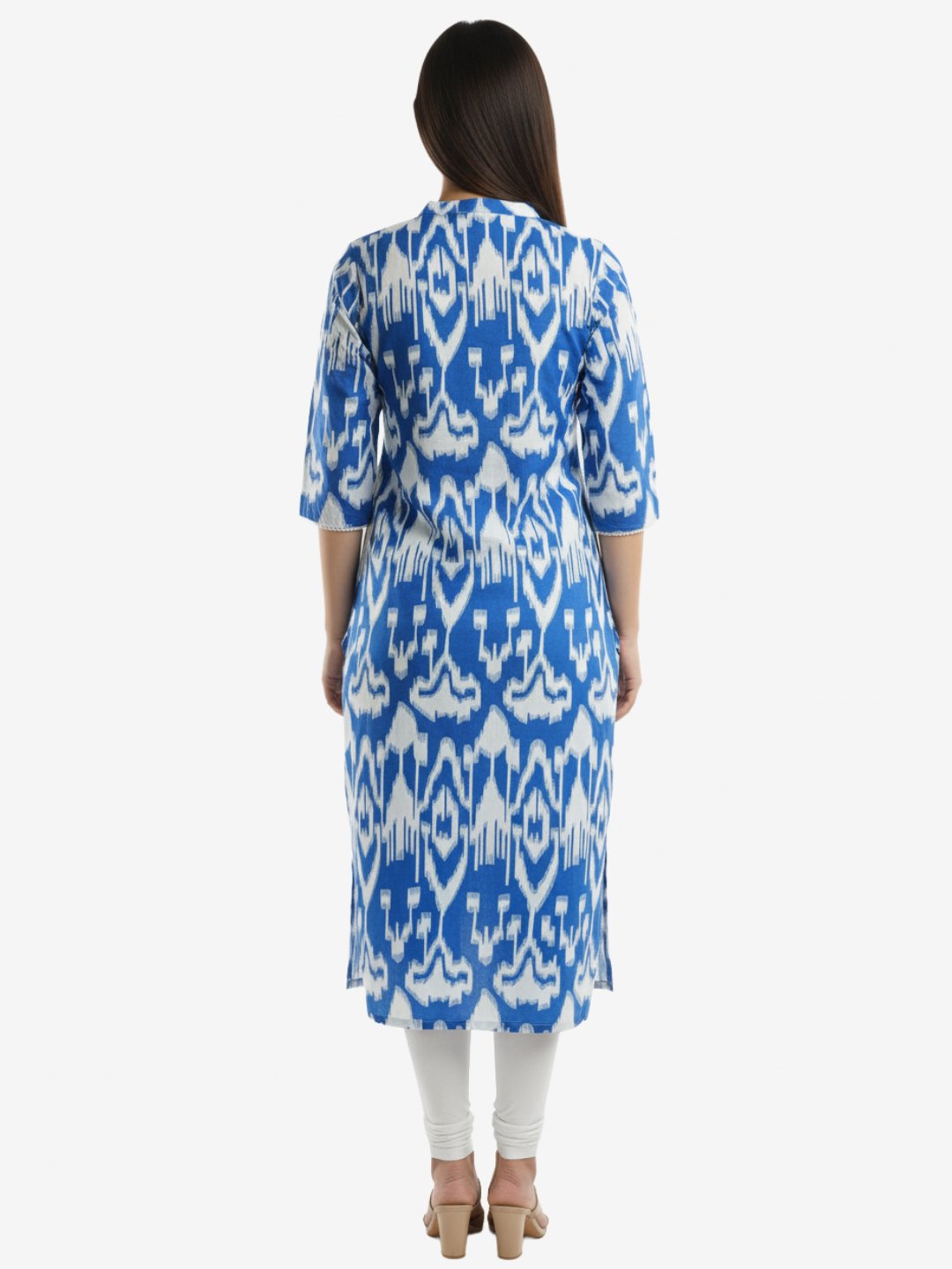 ₹999.00Original price was: ₹999.00.₹500.00Current price is: ₹500.00.Select optionsFabric Soft, breathable cotton Color Blue with white ikat-inspired print Design V-neck,piping front, three-quarter sleeves Fit Straight silhouette Use Work, casual, everyday wear -