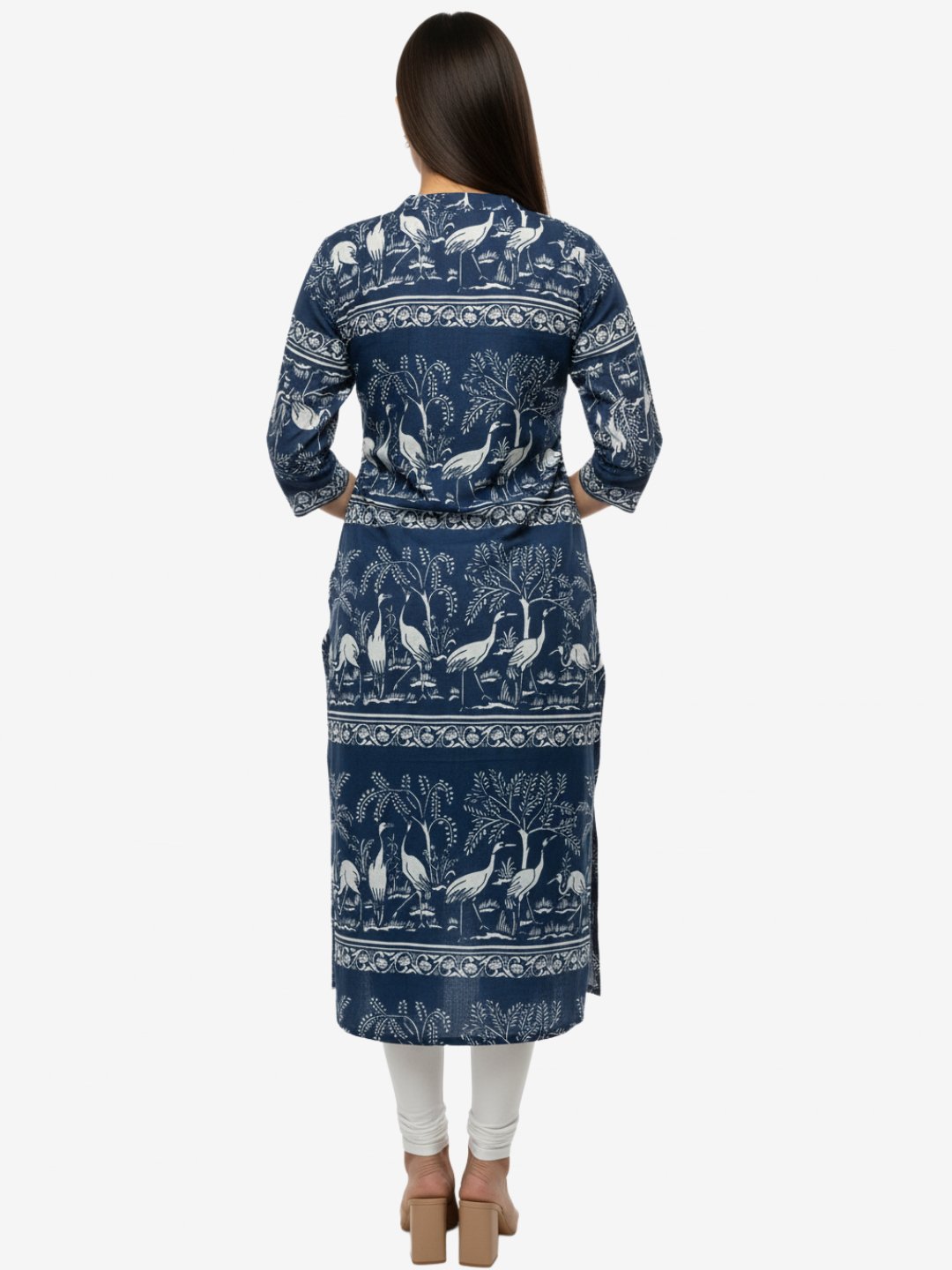 ₹999.00Original price was: ₹999.00.₹500.00Current price is: ₹500.00.Select optionsFabric Soft, breathable cotton Color Navy blue with white tribal bird and tree motifs Design Mandarin collar, partial button placket, three-quarter sleeves Fit Straight silhouette Use Work, casual, festive occasions -