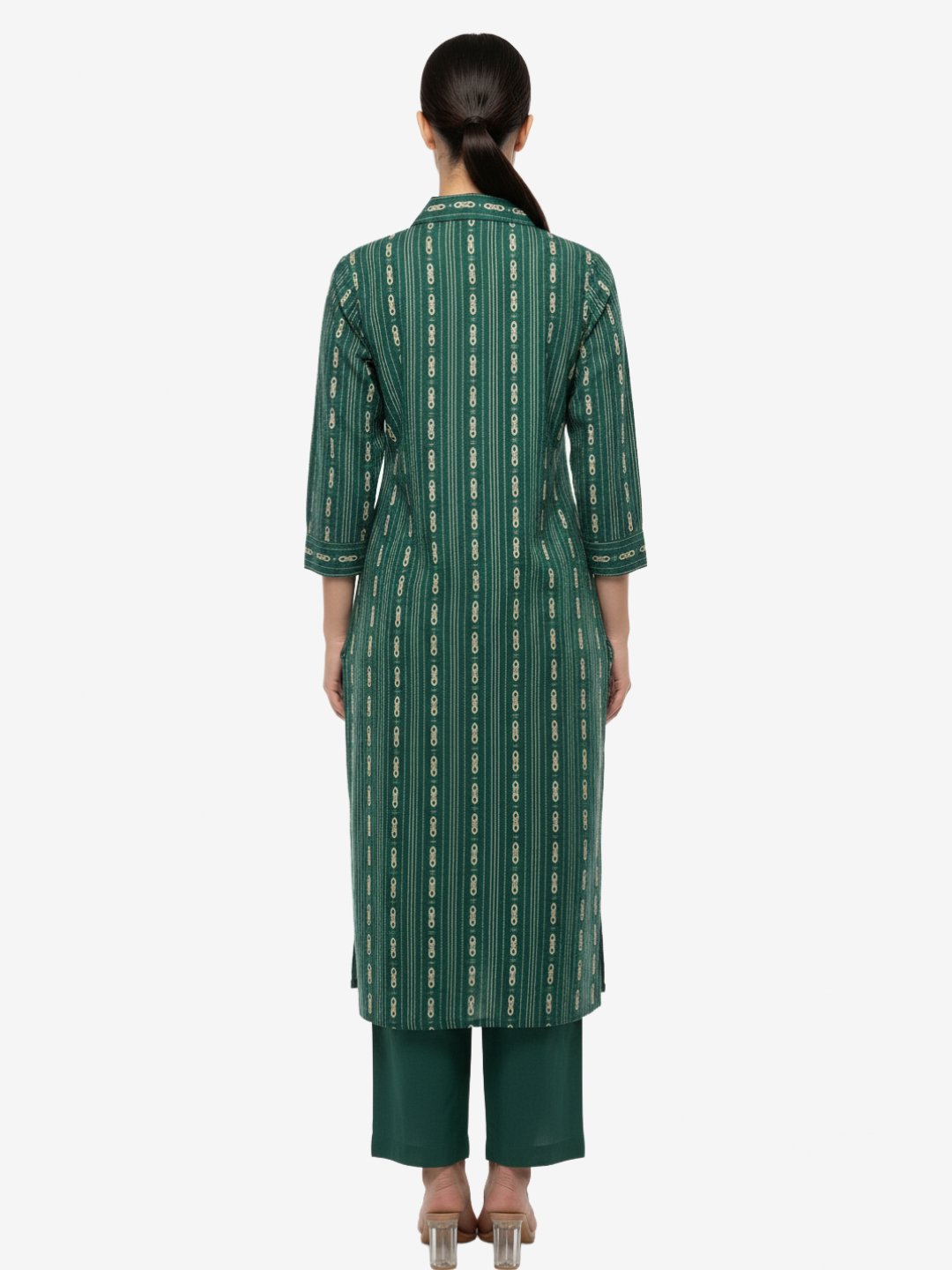 ₹849.00Original price was: ₹849.00.₹349.00Current price is: ₹349.00.Select optionsFabric Cotton Blend Color Dark Green Pattern Vertical Stripes with Gold Embellishments Neck Mandarin Collar with Buttoned Placket Sleeves Three-Quarter Length Style Straight Fit, Knee-Length Kurta with Side Slits Occasion Casual Wear, Office Wear, Festive Wash Care Machine Wash Cold, Do Not Bleach -