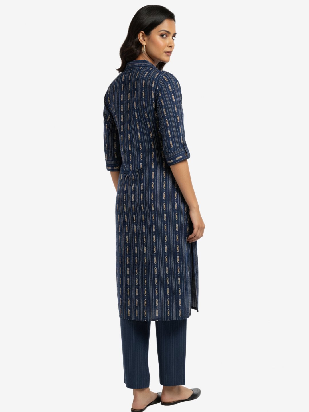 ₹849.00Original price was: ₹849.00.₹349.00Current price is: ₹349.00.Select optionsFabric Cotton Blend Color Dark Blue Pattern Vertical Stripes with Gold Embellishments Neck Mandarin Collar with Buttoned Placket Sleeves Three-Quarter Length Style Straight Fit, Knee-Length Kurta with Side Slits Occasion Casual Wear, Office Wear, Festive Wash Care Machine Wash Cold, Do Not Bleach -