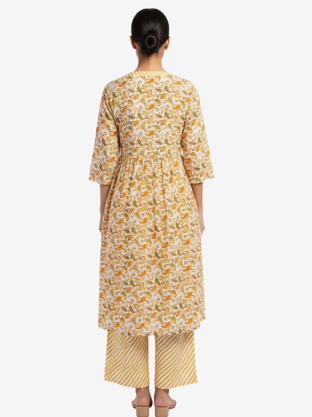 Mustard Yellow Floral Print Cotton Kurta with Striped Pant