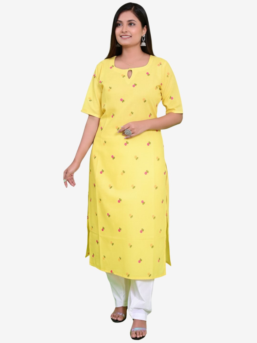 Cotton Embordered Yellow Kurta with Digital Printed Linen Dupatta