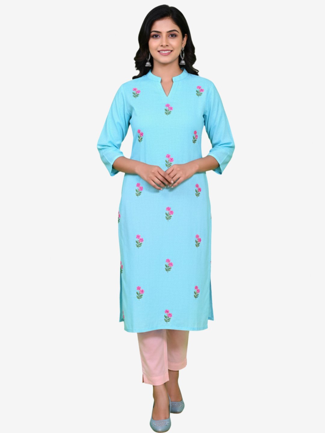 Cotton Embordered Sky Blue Kurta with Digital Printed Linen Dupatta