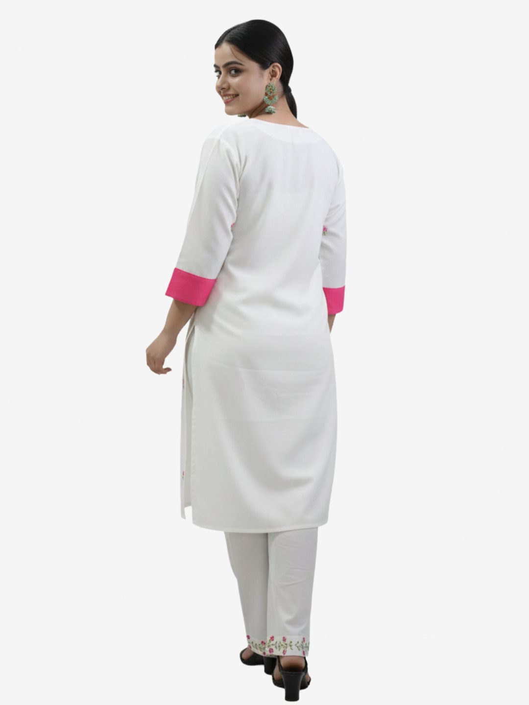 Women Embroidered Cotton Blend A-line White Kurta with Pant