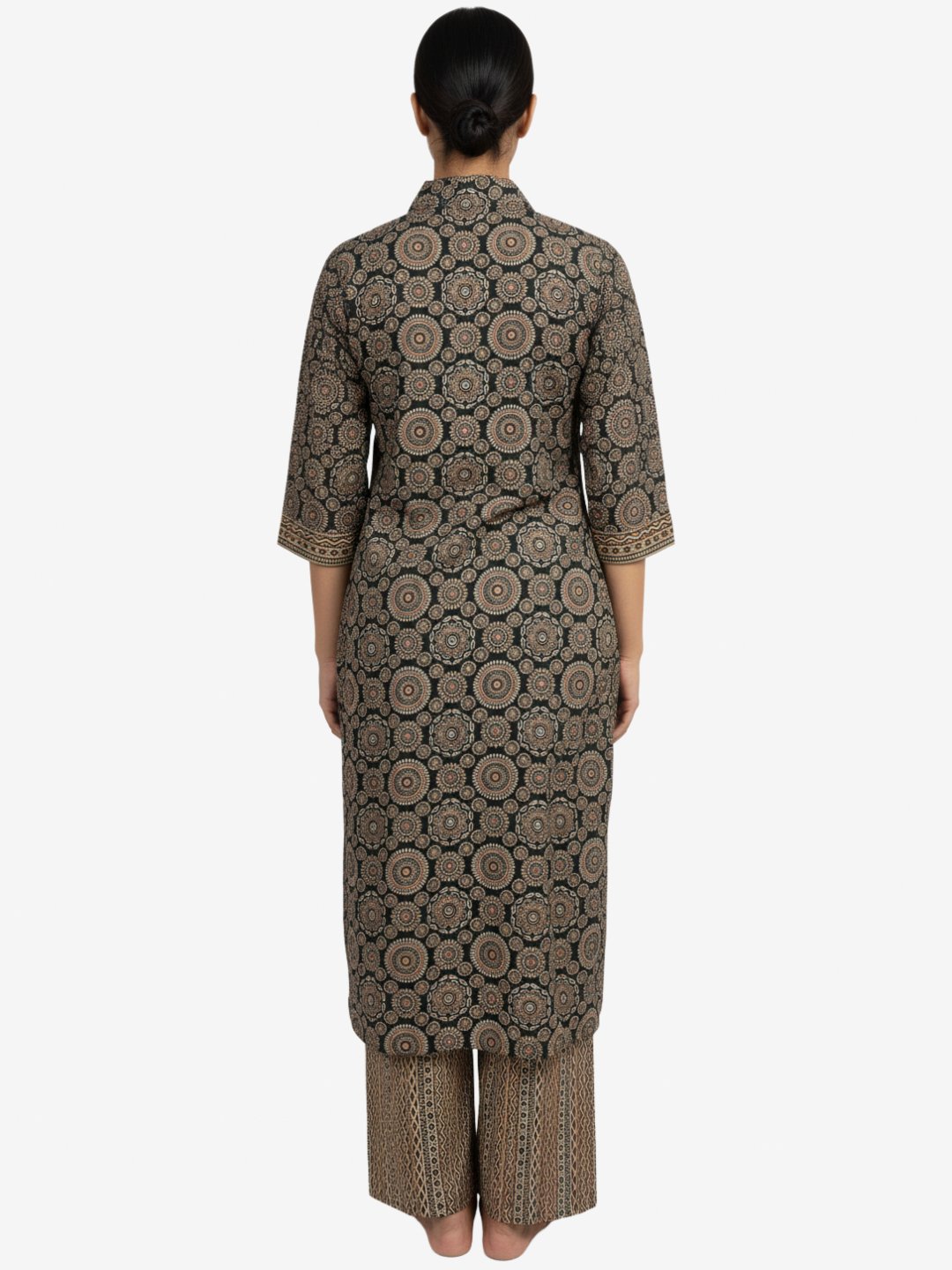 ₹1,499.00Original price was: ₹1,499.00.₹699.00Current price is: ₹699.00.Select optionsStyle Straight kurta with matching pant (2-piece set) Color Black with beige/gold printed circular motifs Neckline Collar neck with button placket for a structured, polished look Sleeves 3/4 sleeves with printed cuff detailing Print/Pattern All-over ethnic circular medallion print on both kurta and pant Bottom Printed straight palazzo pants with coordinating pattern Length Ankle-length kurta for elegant coverage Fabric Cotton blend for breathability and comfort Occasion Office wear, festive events, casual outings, family gatherings Fit Regular fit with relaxed palazzo pants for all-day comfort Care Instructions Gentle machine wash or hand wash separately; do not bleach; dry in shade -
