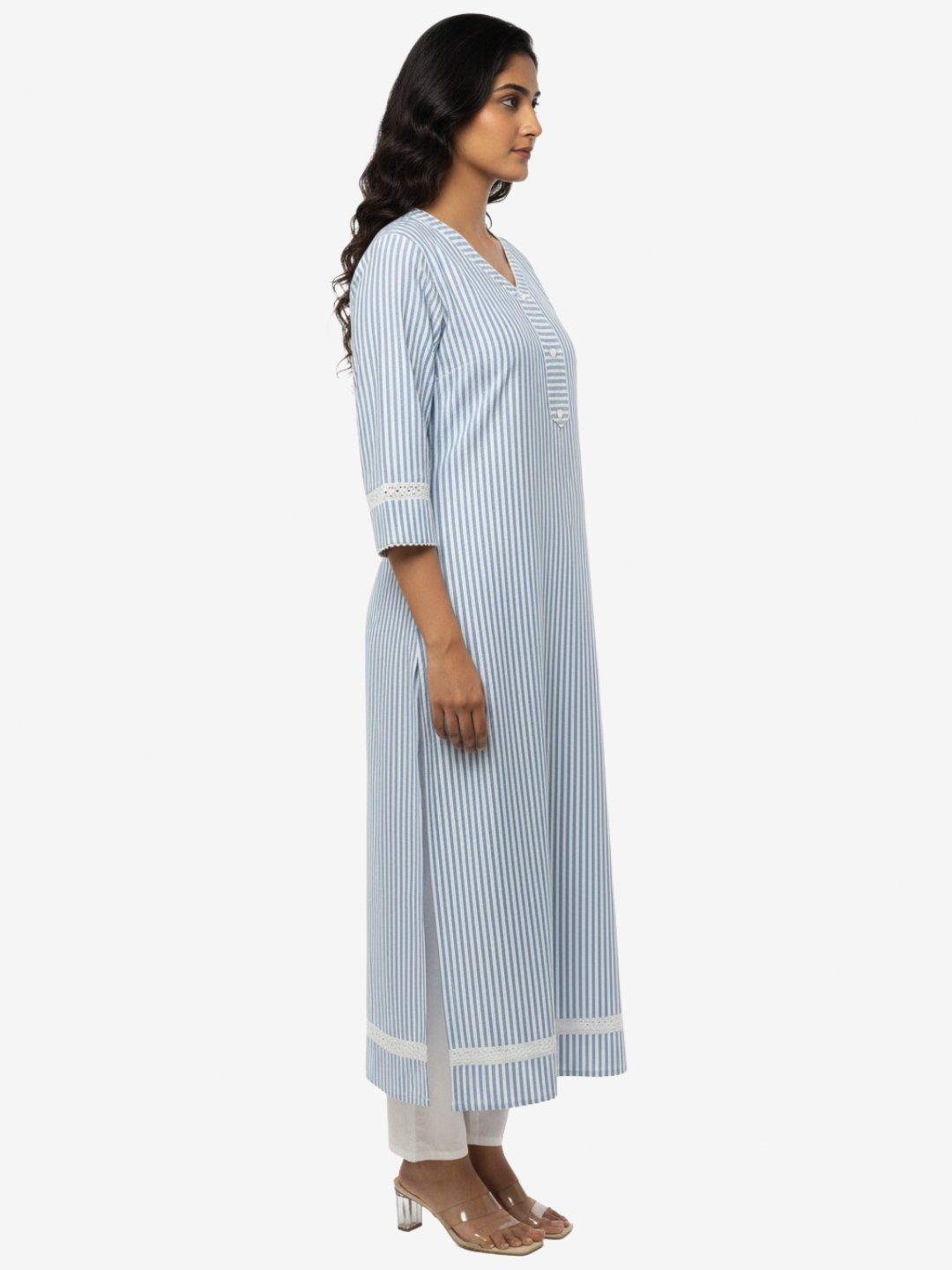 Blue and White Striped Cotton Kurti with Lace Detailing