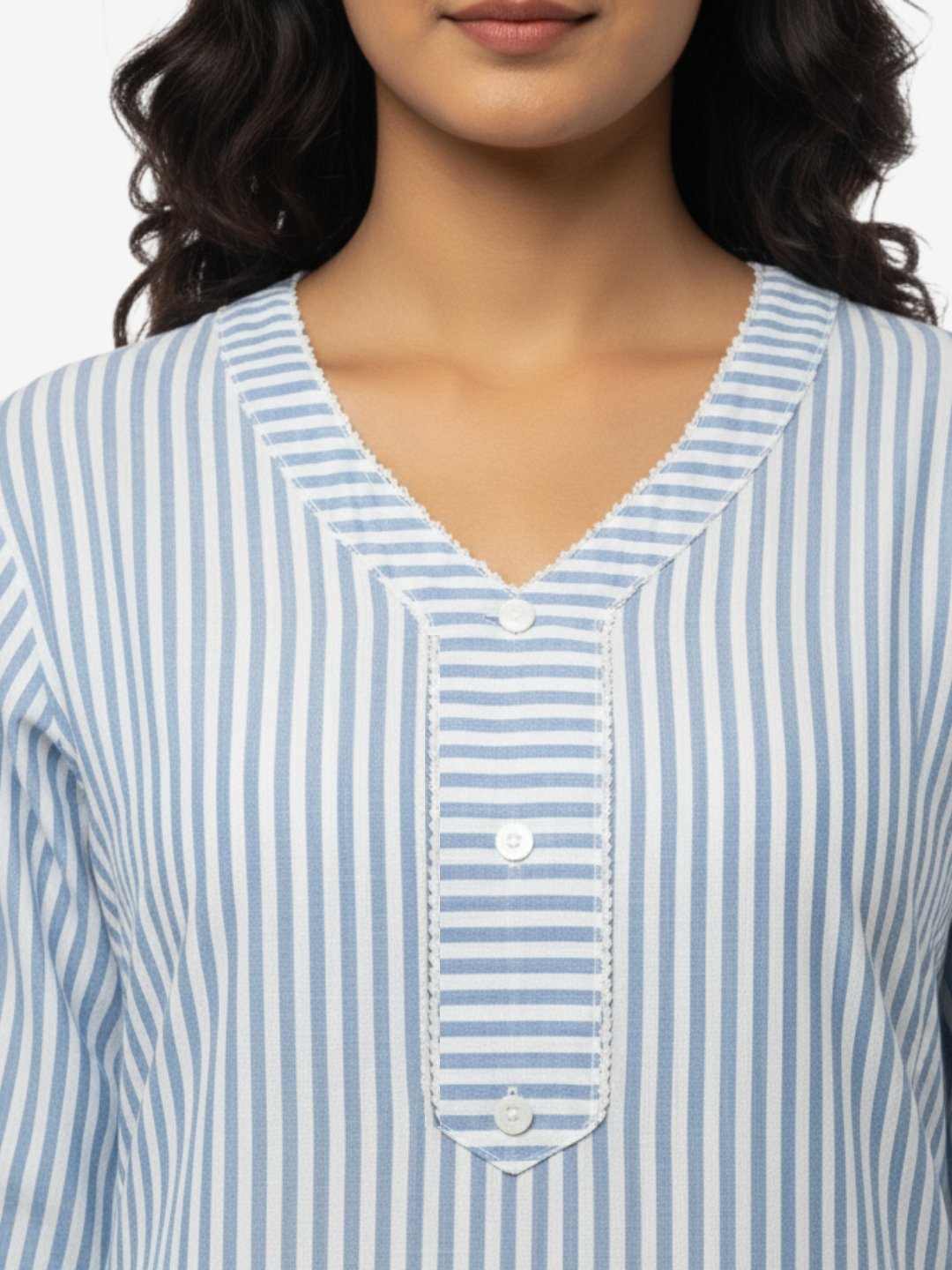 Refresh your wardrobe with this serene blue and white striped cotton kurti, perfect for summer and everyday wear. Crafted from soft, breathable 100% cotton, this kurti features a notched V-neckline and smart button-front placket. The 3/4 sleeves and lower hem are adorned with elegant white lace accents, creating a subtle, feminine touch. Its relaxed straight fit pairs effortlessly with leggings or palazzos for a chic, comfortable look.