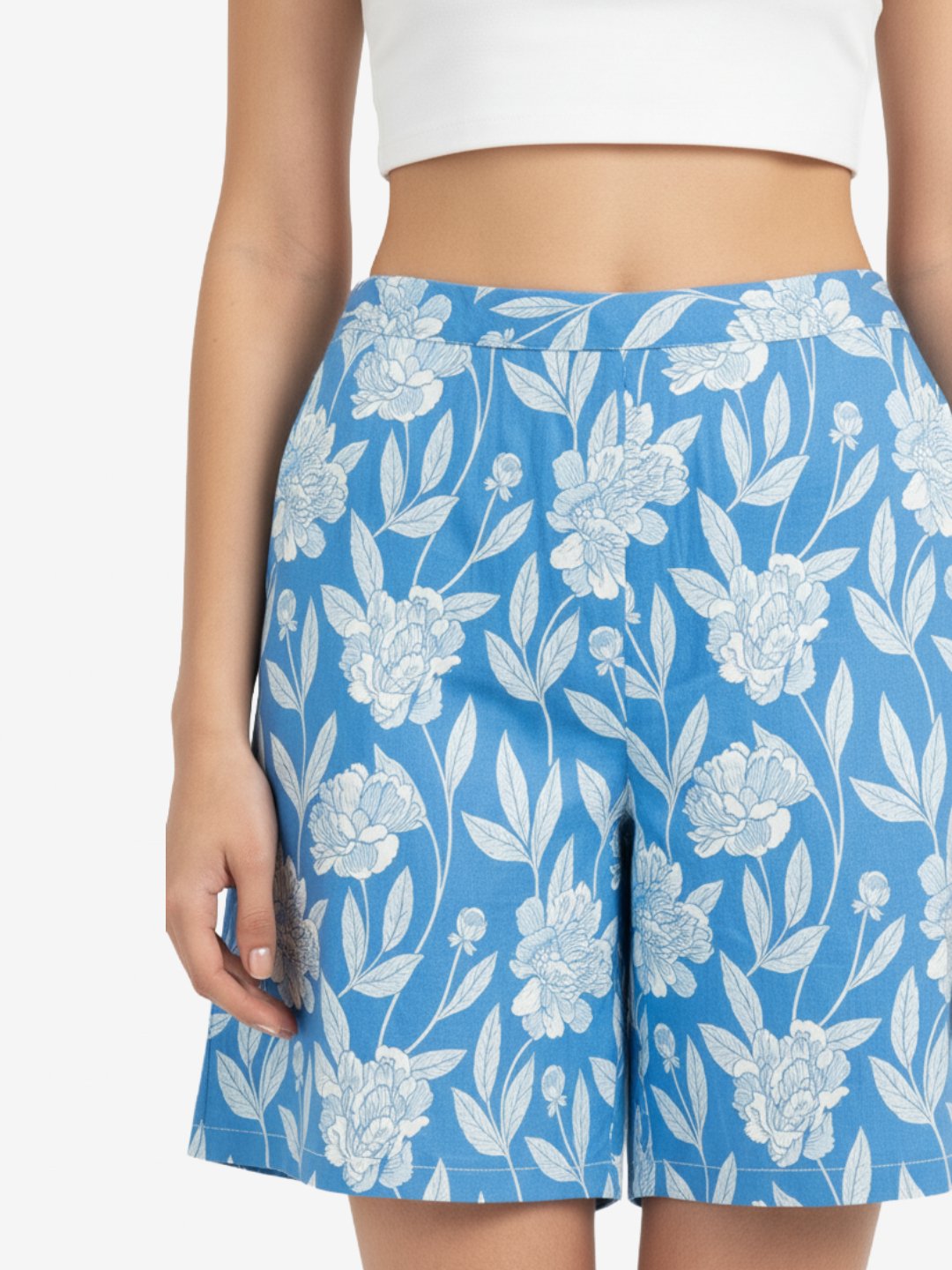 These shorts feature a vibrant blue base adorned with a white floral print, creating a fresh and lively look. The design is tailored for a relaxed fit, with a comfortable length that falls just above the knee, making them suitable for casual summer outings. Crafted from lightweight material, these shorts combine style and comfort, and the eye-catching floral pattern adds a touch of elegance to everyday wear.