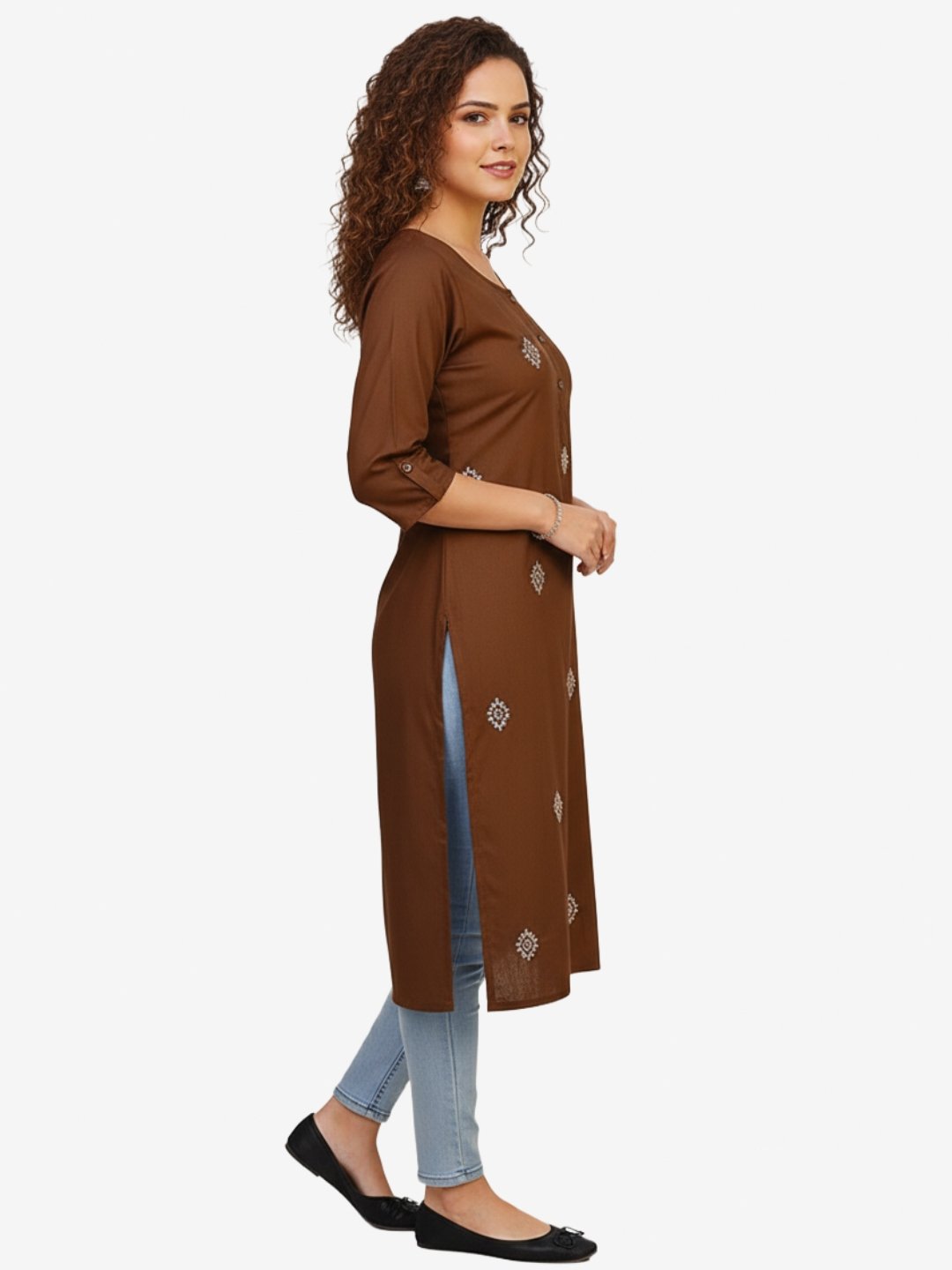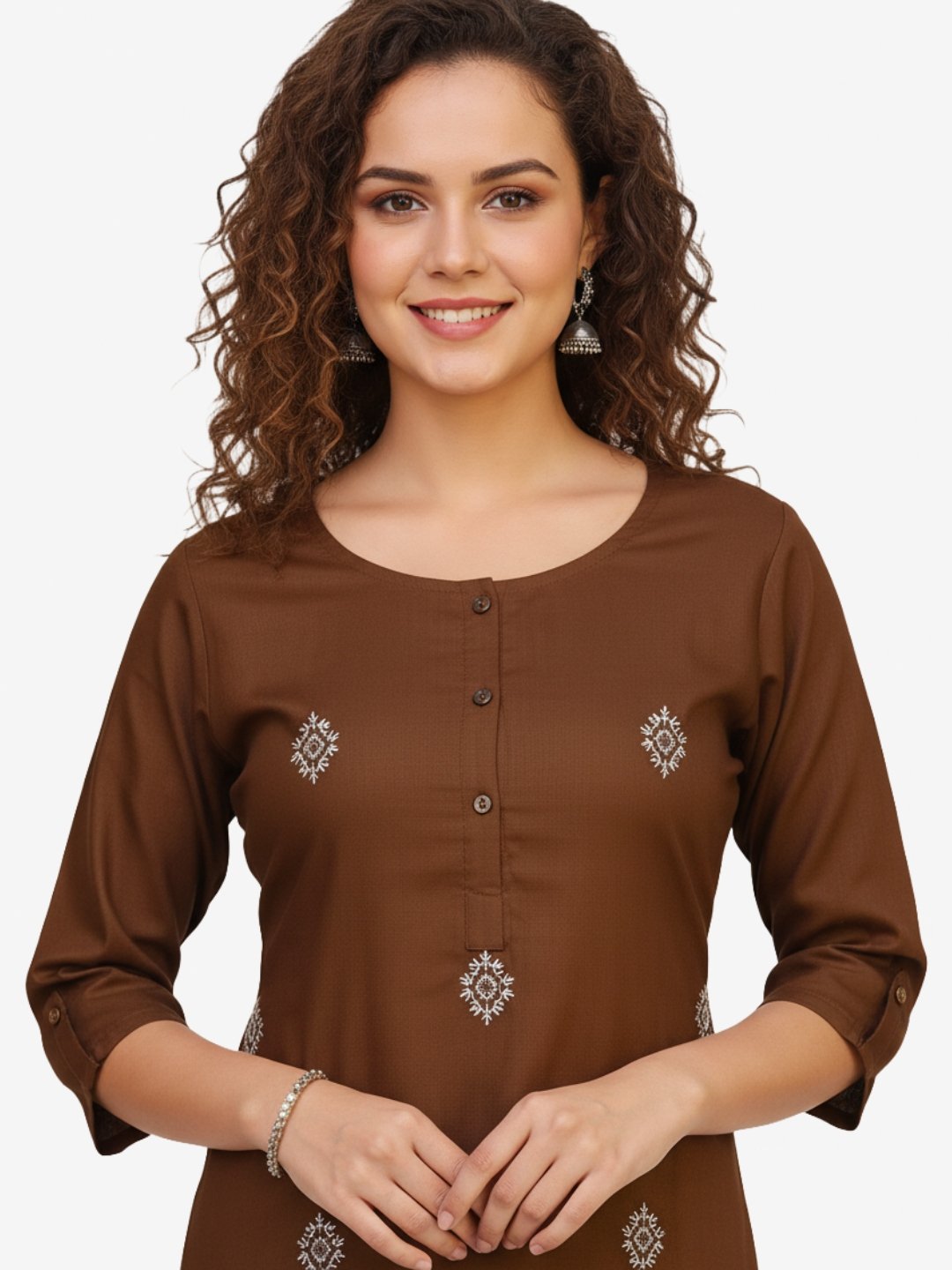 Chocolate Bourbon Kurti with Embroidery – this plain solid colored long Kurti is classic. This Kurti can be teamed up with any kind of bottoms. You can wear it for your meetings as this gives a formal look. Bourbon brown Kurti has a high round collar with a front slit and buttons. It has quarter sleeves which look classy. The Kurti has floral booties all over. Bourbon Embroidered Linen Kurti