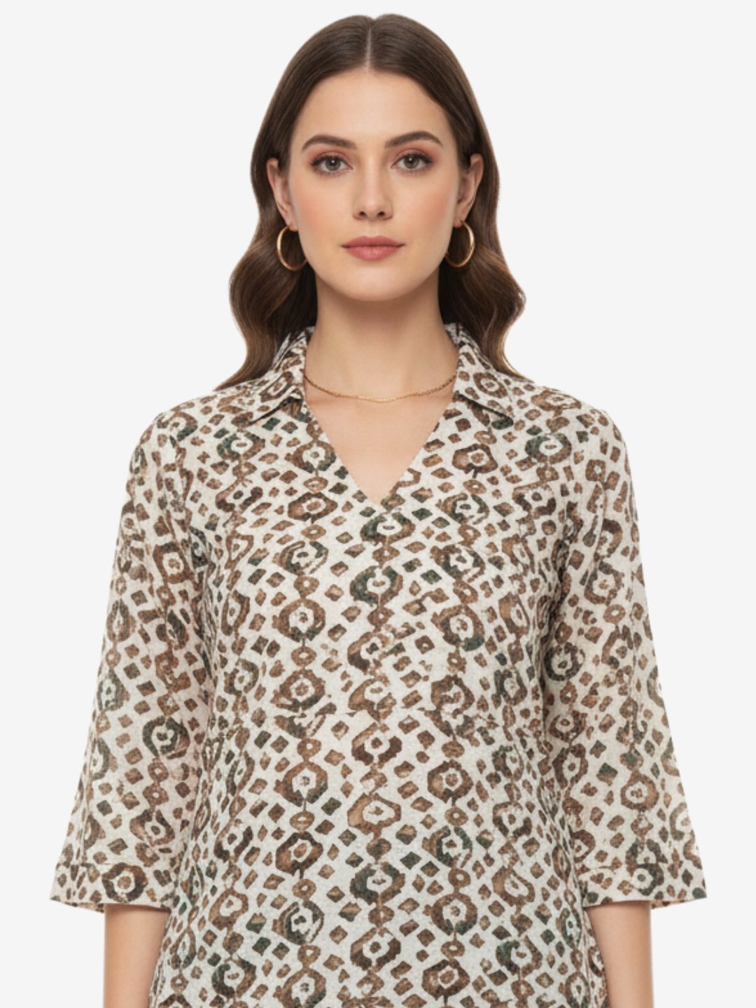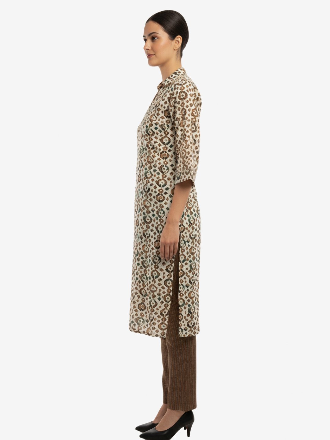 | Kurta Style | Straight-cut with shirt collar, button-down front, and three-quarter sleeves. |