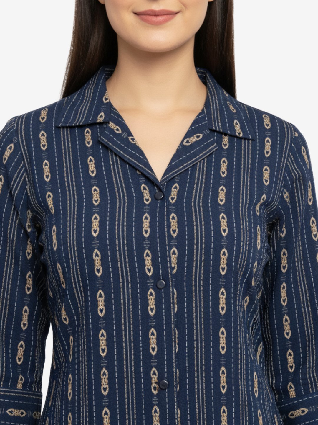 | Neckline | Collar neck with button placket for a structured, polished look |
