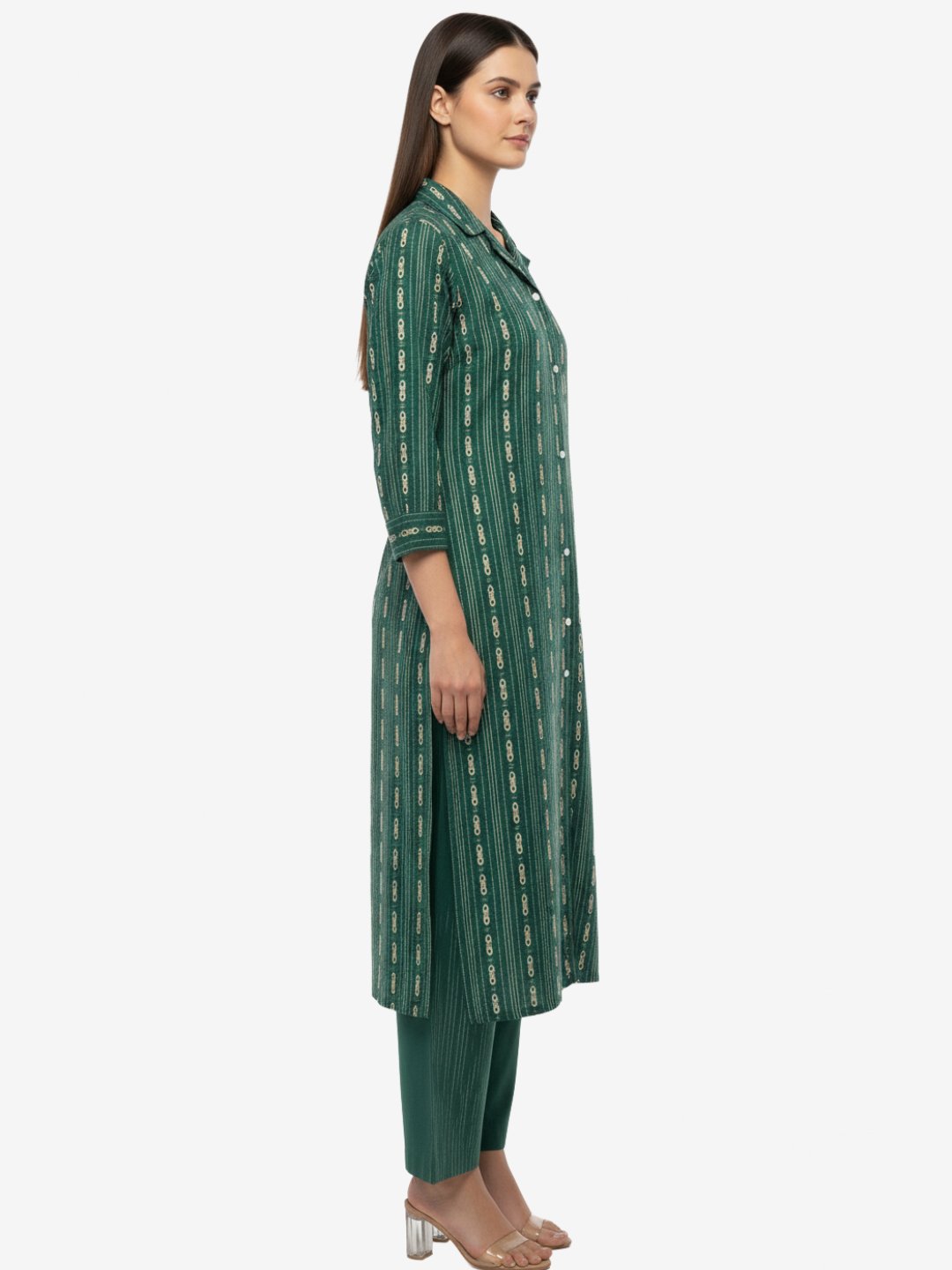 Elevate your ethnic wardrobe with this stunning green striped kurta pant set, blending traditional charm with modern comfort. Crafted from premium breathable cotton, the collared kurta features subtle vertical stripes in gold accents, a button-down placket, and convenient side pockets for everyday ease. The 3/4th sleeves with roll-up cuffs add a stylish touch, while the straight-fit kurta pairs seamlessly with matching straight pant for a flattering silhouette.