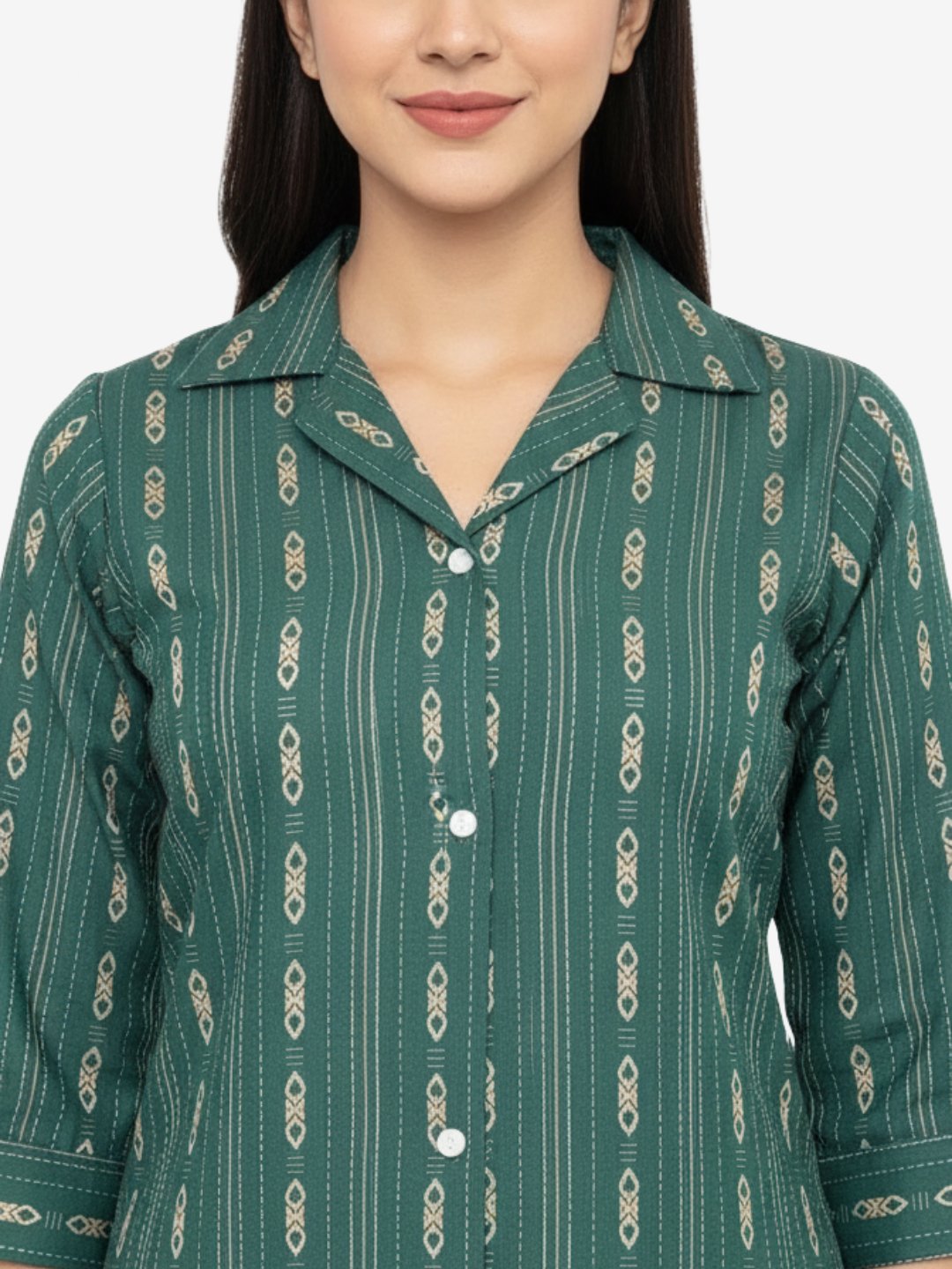 | Kurta Style | Straight-cut with shirt collar, button-down front, and three-quarter sleeves. |
