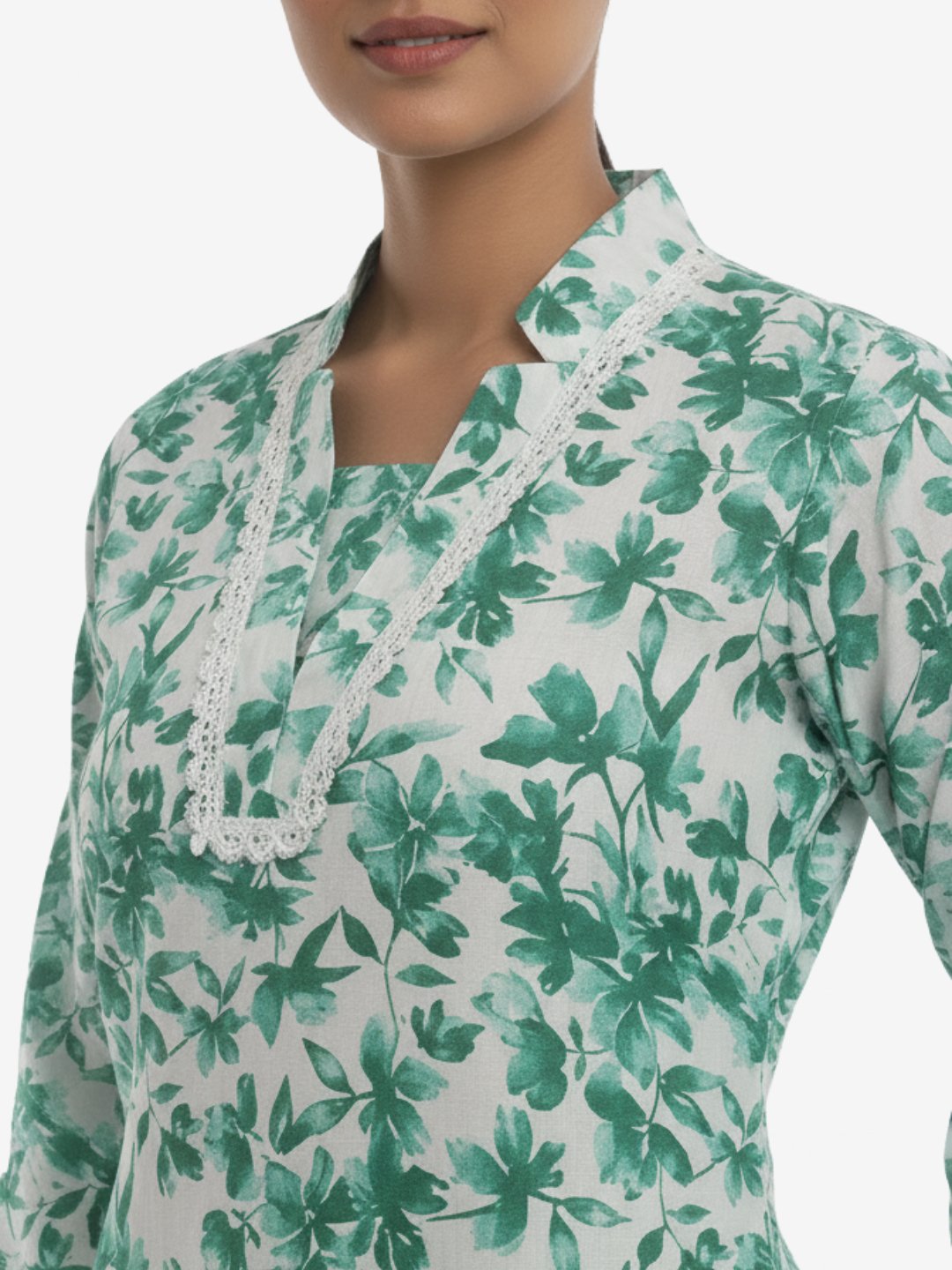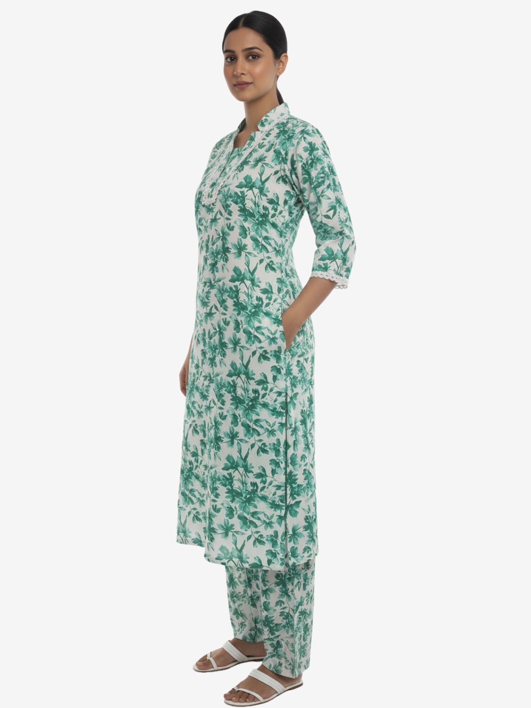 - Design: V-neck kurta with 3/4th sleeves and subtle Green Discover this elegant floral printed kurta pant set in crisp white with Green florals.Viscose Rayon A-line V-neck kurta, 3/4th sleeves, ankle length, regular fit—perfect for casual, office & ethnic wear. Shop now for comfort & style!d floral embroidery on a crisp white base; straight-fit pants for a modern ethnic look.