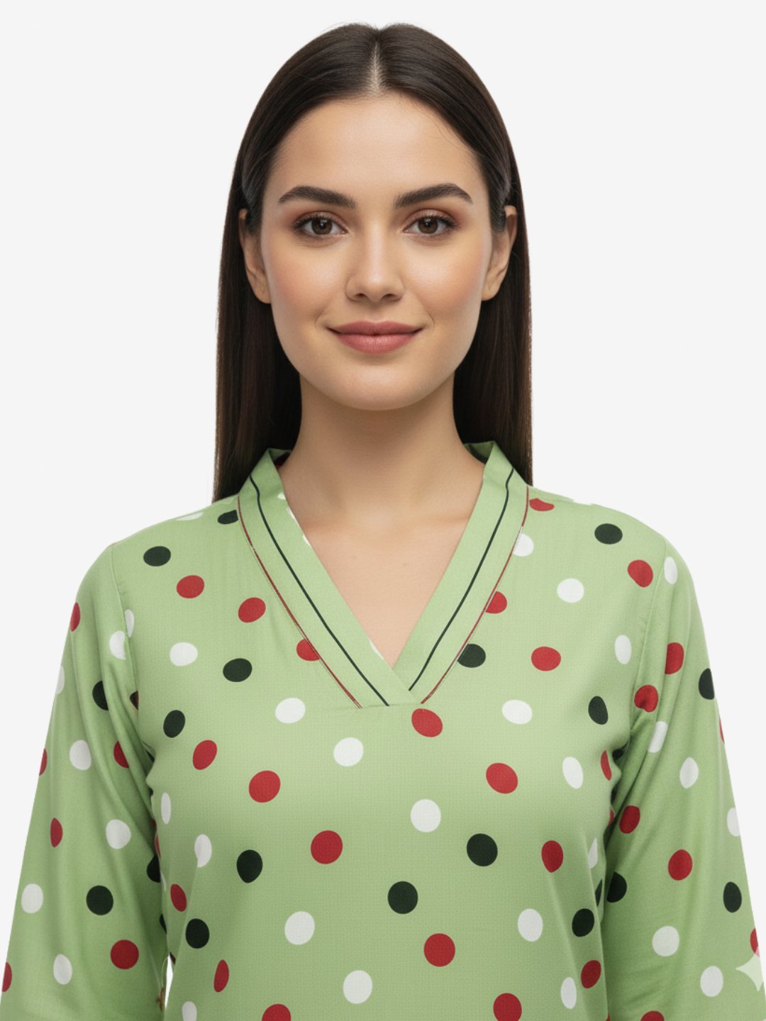| Bottom | Solid green straight pants with printed hem detailing |