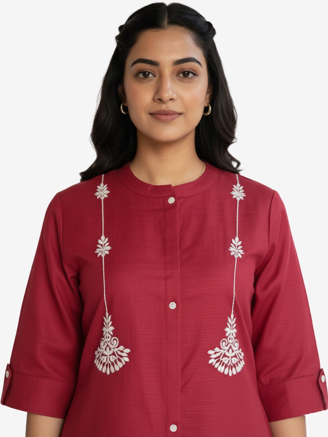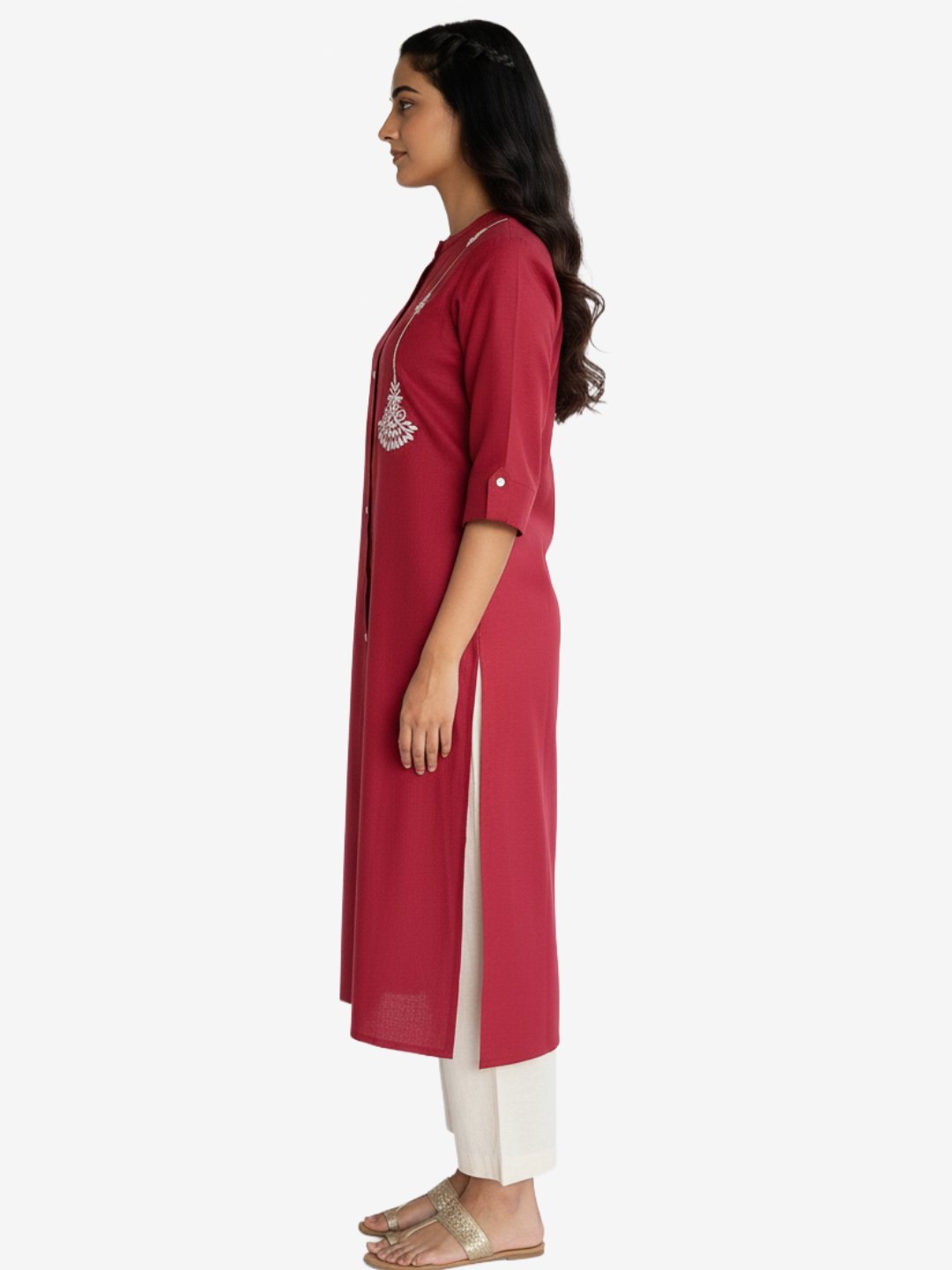 The kurta is styled with a round neckline and a front button placket, adding a touch of minimal charm. Delicate embroidered motifs cascade down the front, lending a graceful, feminine appeal without overwhelming the design. The three-quarter sleeves with subtle cuff detailing enhance its refined look, making it suitable for both casual outings and semi-formal occasions.