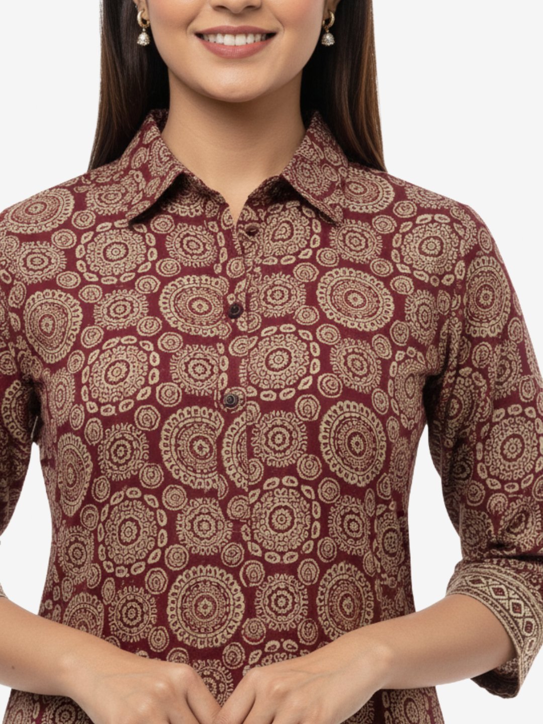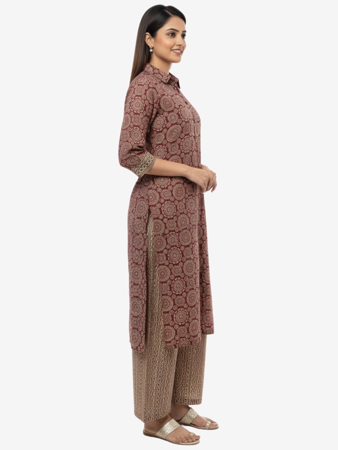 Maroon Printed Straight Kurta Pant Set with Collar Neck for Women