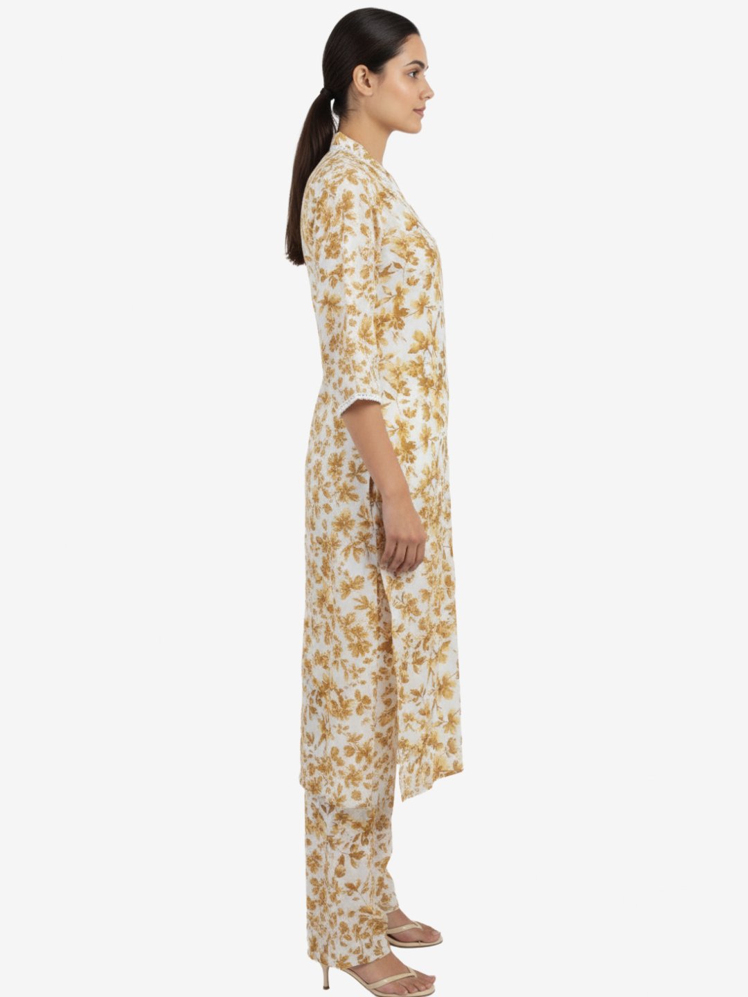 - Design: V-neck kurta with 3/4th sleeves and subtle mustarDiscover this elegant floral printed kurta pant set in crisp white with mustard florals.Viscose Rayon A-line V-neck kurta, 3/4th sleeves, ankle length, regular fit—perfect for casual, office & ethnic wear. Shop now for comfort & style!d floral embroidery on a crisp white base; straight-fit pants for a modern ethnic look.