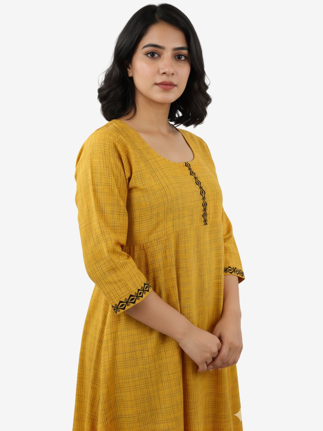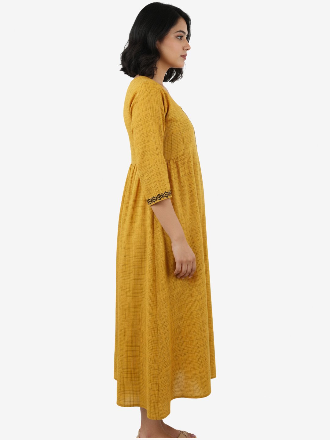 Step out in style with this mustard yellow cotton maxi dress, designed for effortless elegance and comfort. Featuring subtle checked patterns and black embroidered details on the neckline and sleeve cuffs, this dress provides a charming ethnic touch. The relaxed fit and three-quarter sleeves offer easy movement, while the soft, breathable 100% cotton fabric keeps you cool for all-day wear. Perfect for festive gatherings or daily outings.