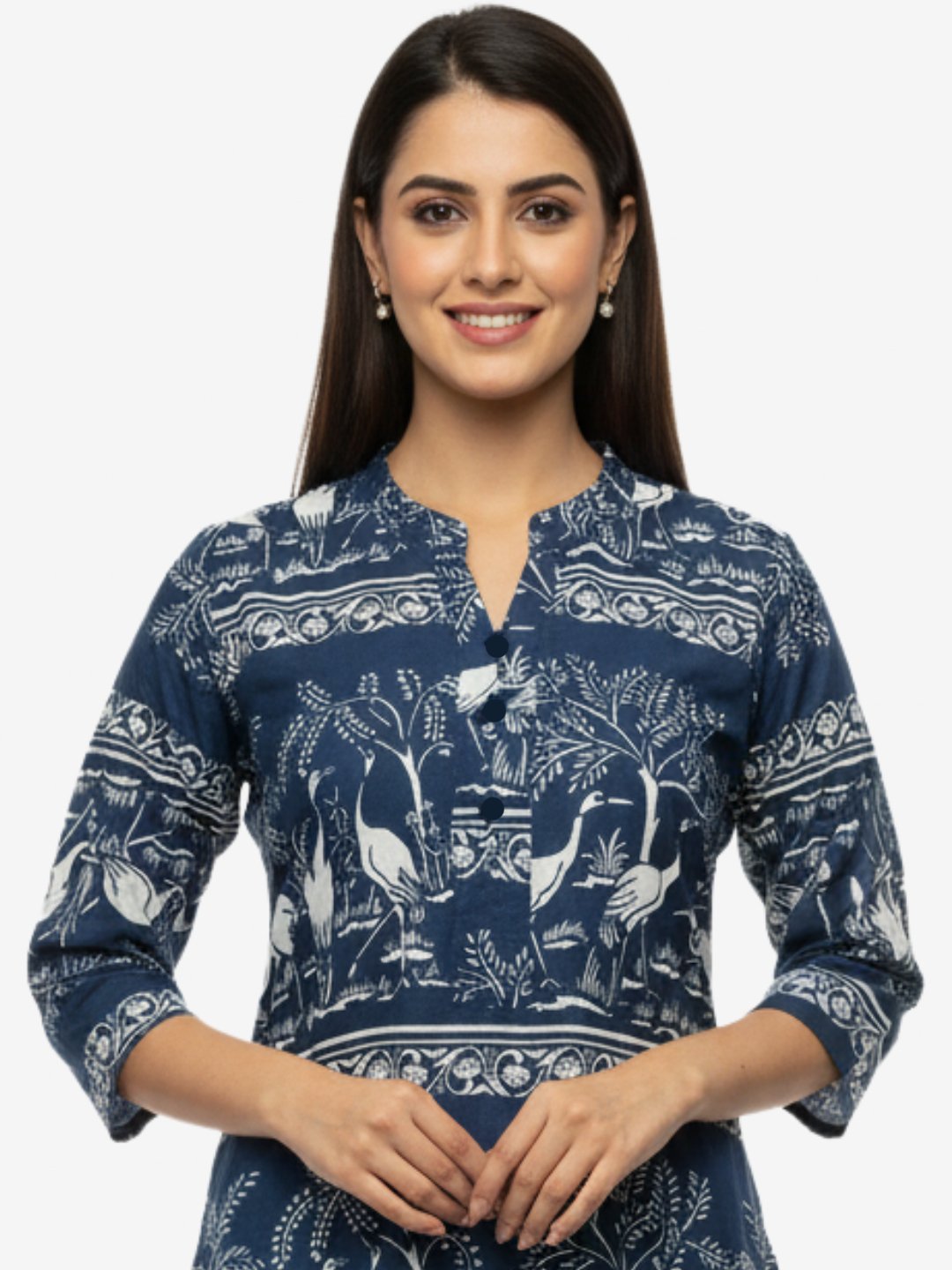 Elevate your ethnic style with this navy cotton kurta adorned with striking white tribal bird and tree motifs in horizontal panels. Crafted from lightweight, breathable cotton, this straight-fit kurta features a mandarin collar, partial button placket, and three-quarter sleeves for all-day comfort. The unique handblock-inspired design combines tradition and contemporary fashion, making it ideal for work, casual outings, or festive occasions.