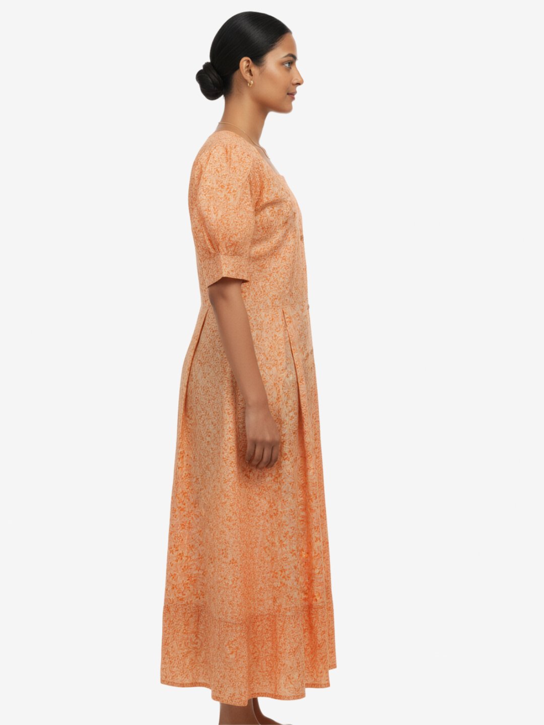 Orange Floral Cotton Maxi Dress with Puff Sleeves