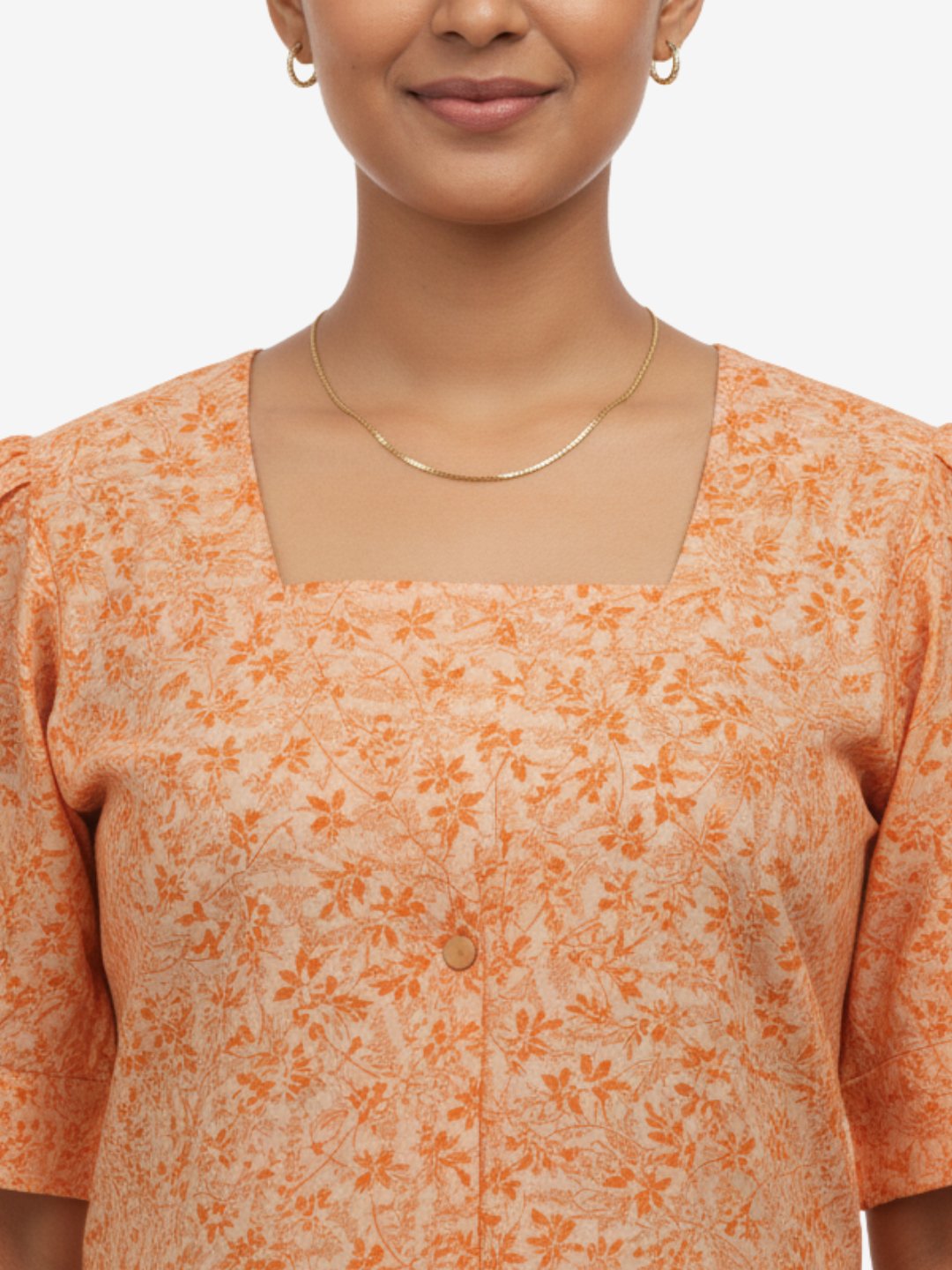 Refresh your summer wardrobe with this charming orange floral cotton maxi dress. Featuring an all-over delicate floral print, the dress is styled with a square neckline and distinctive puffed short sleeves for a touch of elegance. The flared silhouette and tiered hemline create a graceful and airy look, ideal for day outings and relaxed gatherings. Made with soft, breathable 100% cotton fabric, it ensures comfortable wear all day long.