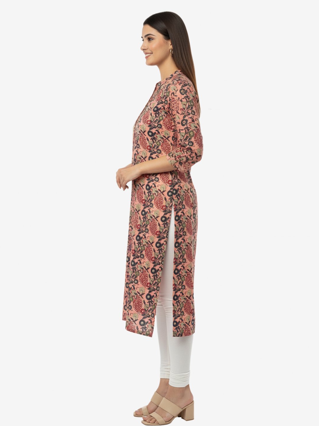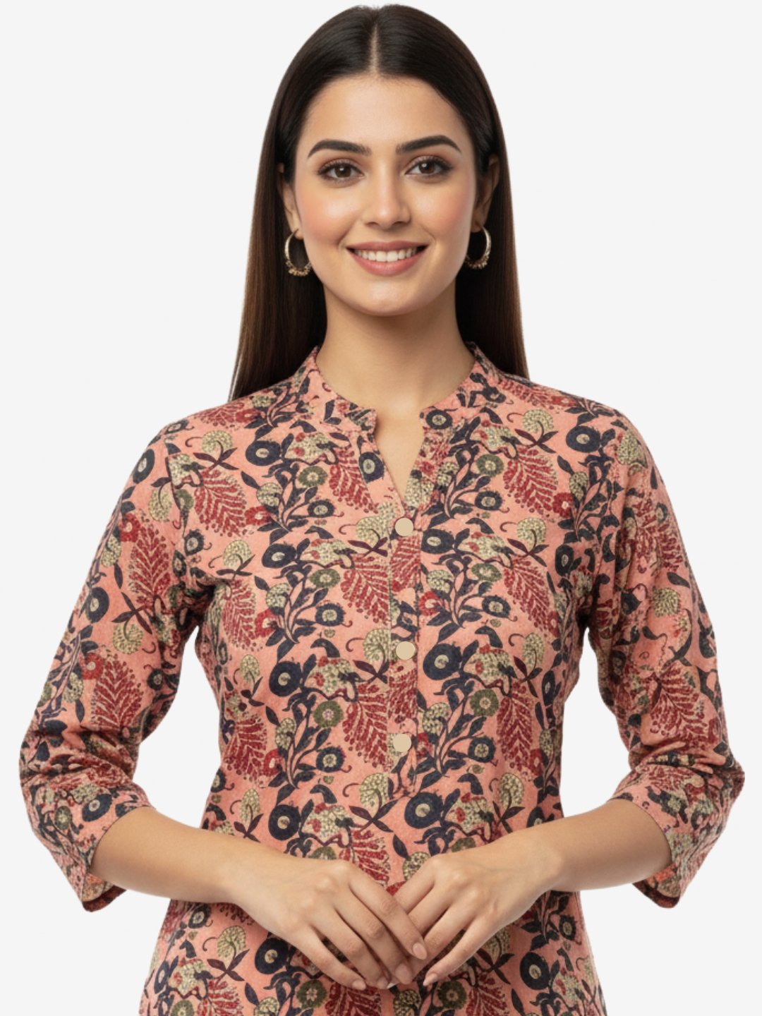 Add a touch of ethnic charm to your wardrobe with this pink cotton kurta, featuring an intricate Jaipuri-inspired floral print in navy and beige. Designed with a straight fit, this kurta is tailored from airy, breathable cotton for all-day comfort. A mandarin collar, partial buttoned placket, and three-quarter sleeves give it a versatile style, making it perfect for work, casual outings, or festive gatherings.
