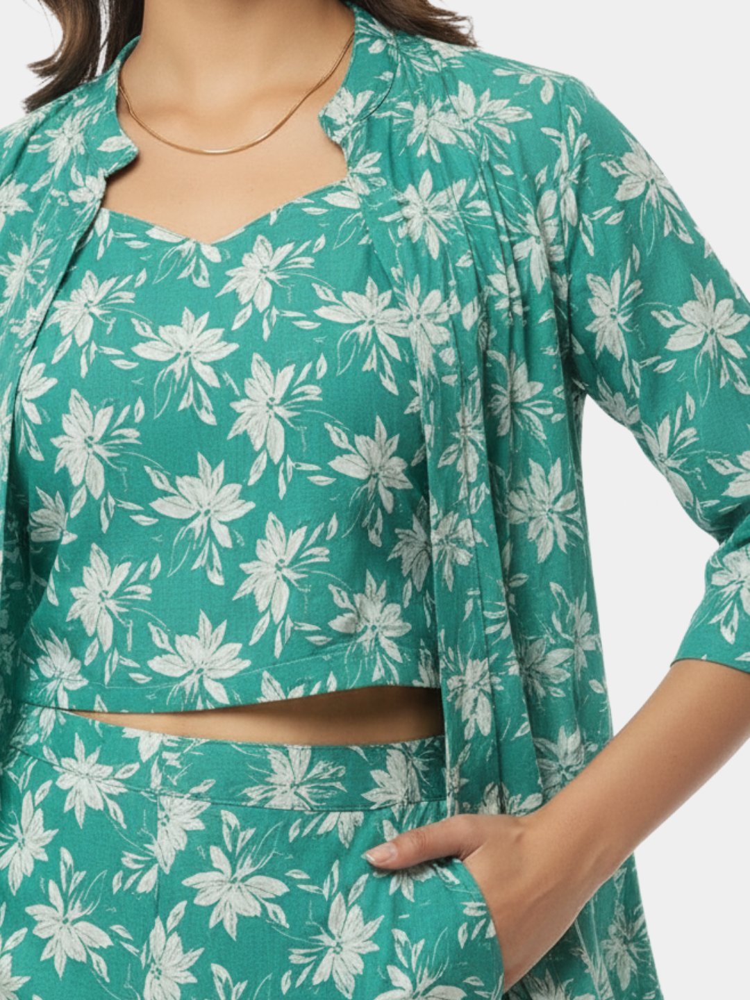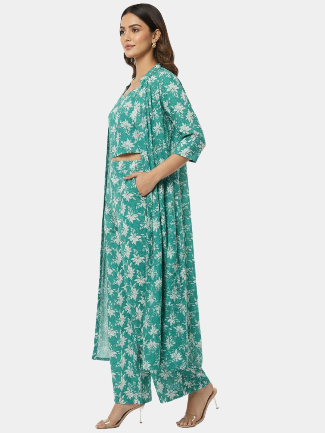 This product is a stylish women’s three-piece set featuring a teal base with white floral prints. It includes a crop top, wide-leg pants, and a matching long shrug, designed for comfort and a chic, coordinated look suitable for casual outings and festive occasions.
