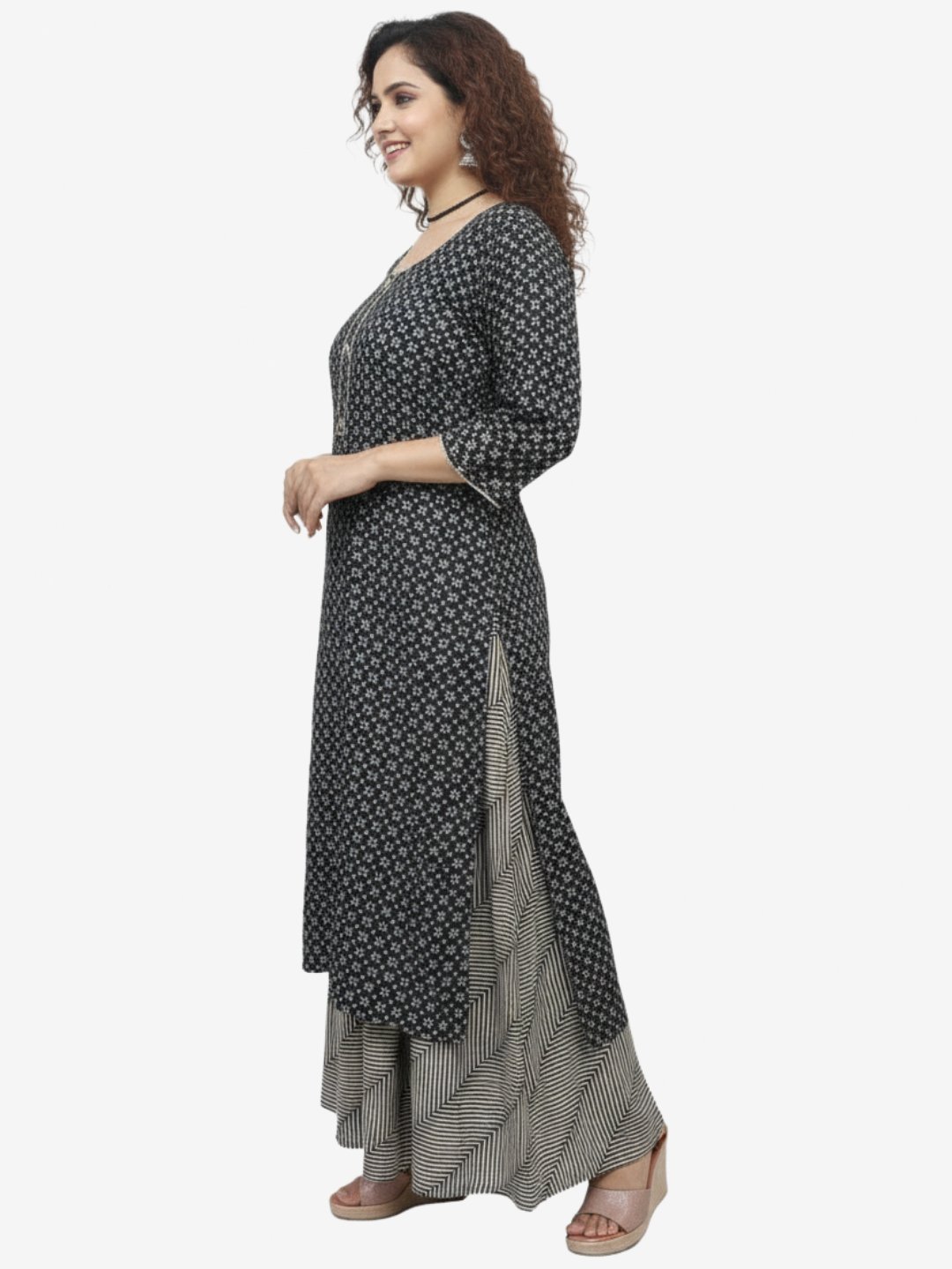 Black Printed Straight Kurta Pant Set with Collar Neck for Women