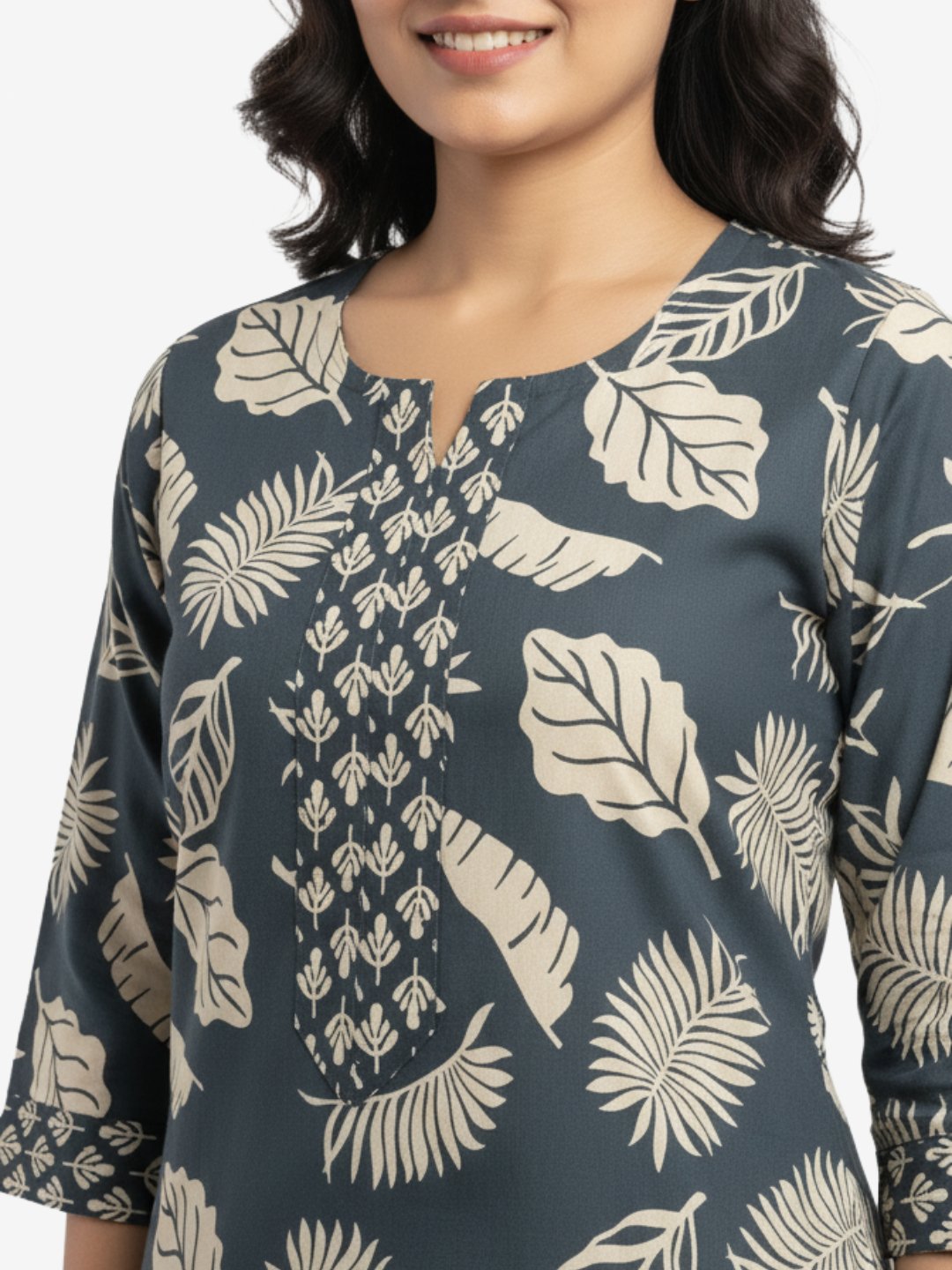 The kurta features a soothing gray base adorned with delicate leaf-inspired prints that add a touch of nature-inspired charm. Its straight silhouette, three-quarter sleeves, and subtly detailed neckline create a flattering and versatile look that works for both casual outings and relaxed festive occasions.