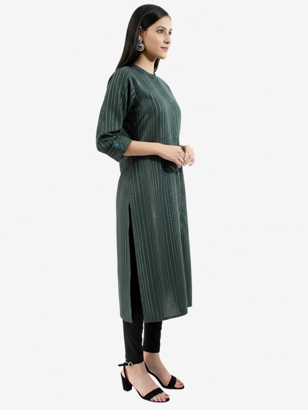 Olive Green Embroidered Straight Kurti with Floral Detailing and 3/4 Sleeves