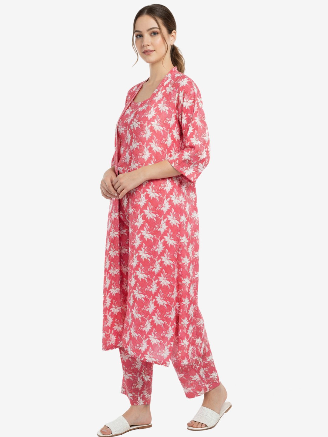 Elevate your ethnic wardrobe with this elegant pink floral printed three-piece co-ord set for women. Designed with a modern silhouette and comfortable fabric, this stylish set includes a printed crop top, matching straight pants, and a flowy long shrug that adds a layered and sophisticated touch.