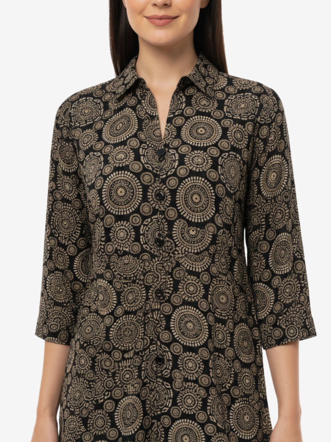 • Women’s Black Printed Cotton Top | 3/4 Sleeve Shirt Collar Tunic