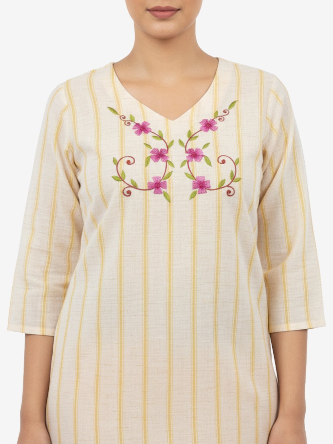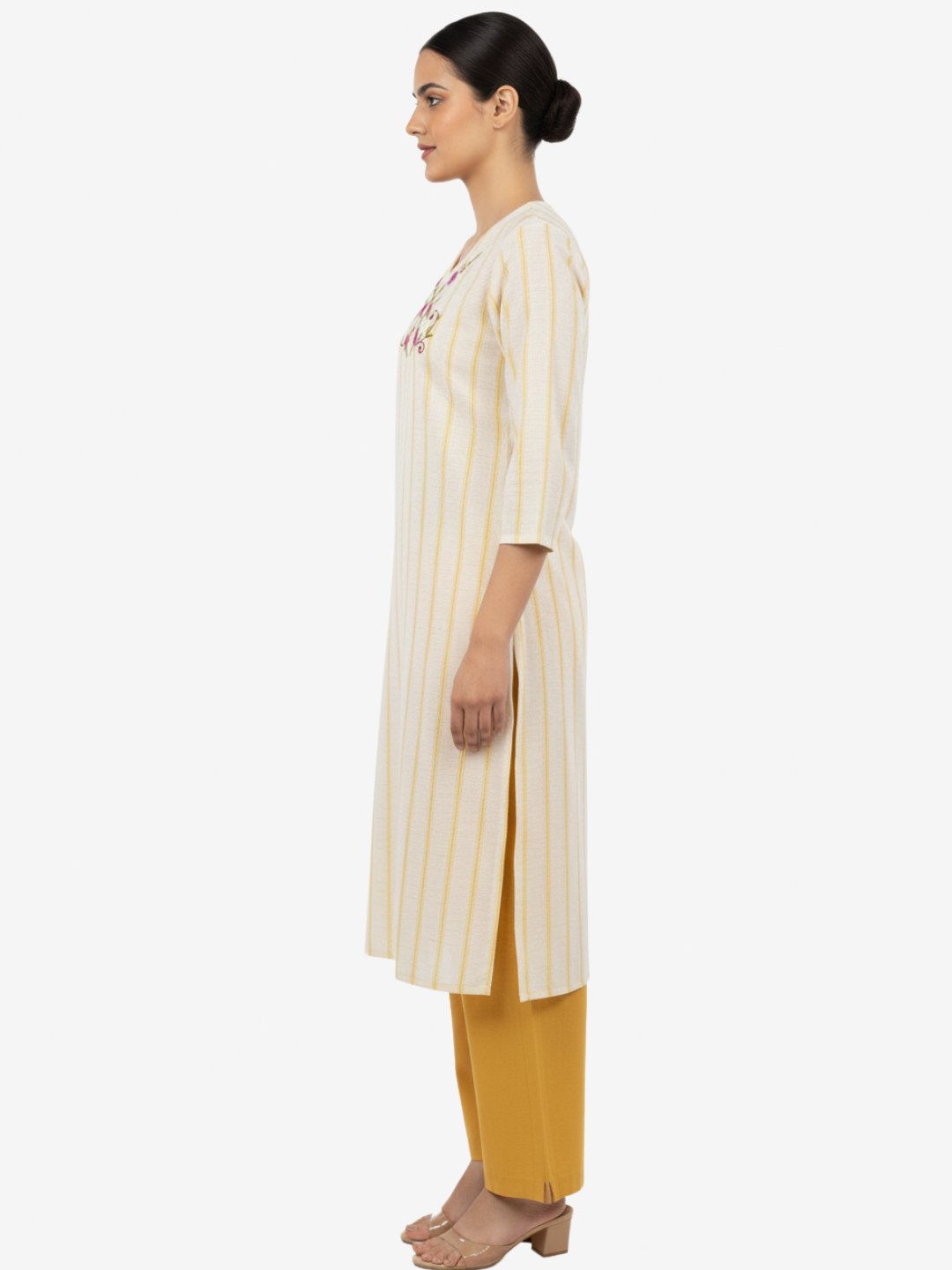 The kurta features a soothing off-white base with subtle vertical stripes, beautifully complemented by delicate floral embroidery on the neckline that adds a touch of femininity and charm. Designed with a flattering V-neck and three-quarter sleeves, the straight-cut silhouette ensures a graceful and comfortable fit. Paired with solid mustard straight pants, this set creates a balanced and stylish ethnic look.