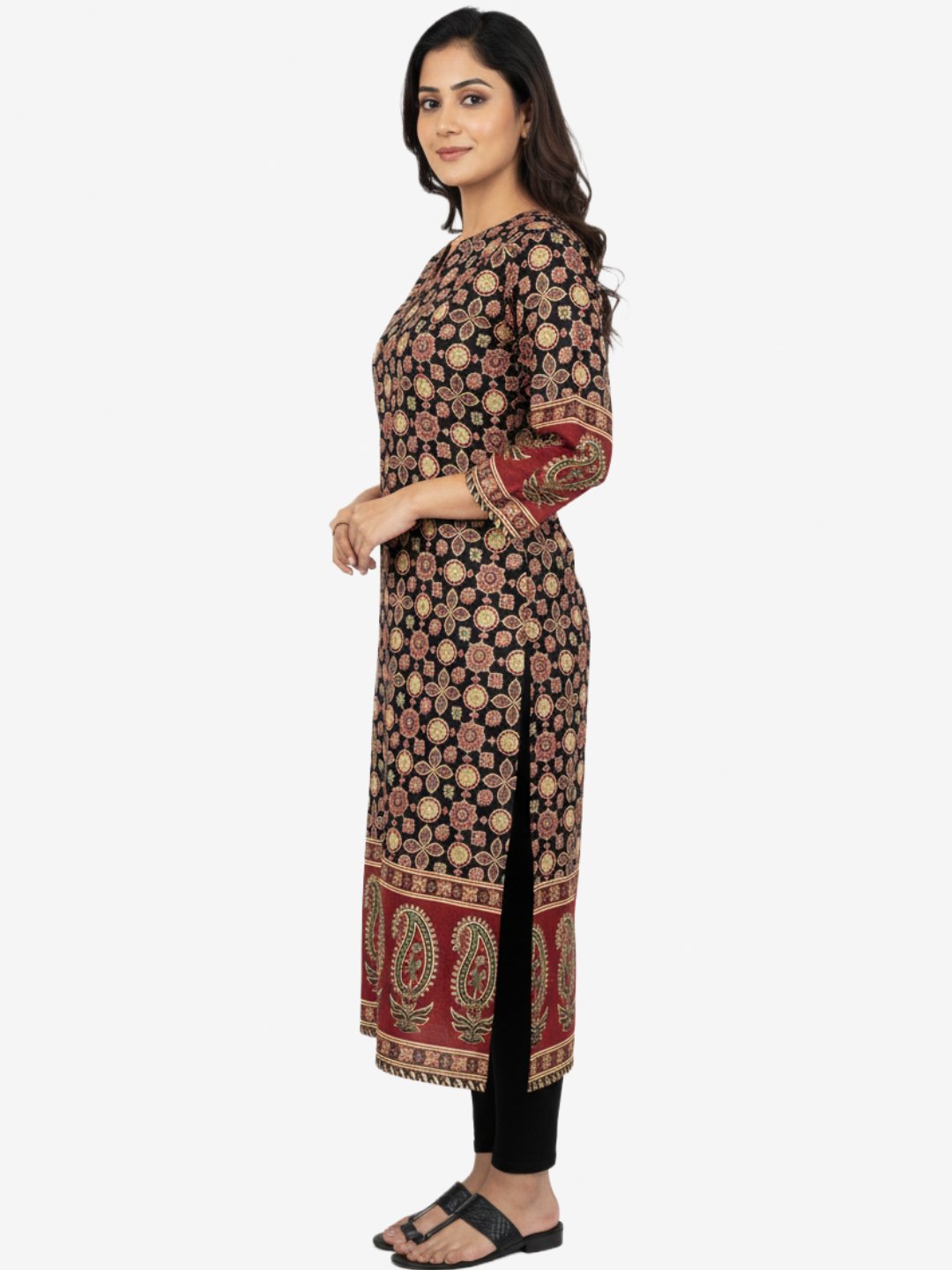 The rich dark base is complemented by warm earthy tones, while the contrasting red border at the hem and sleeves showcases detailed paisley motifs for a striking finish. The three-quarter sleeves and classic round neckline with subtle detailing enhance its graceful silhouette, making it perfect for both everyday wear and festive occasions.