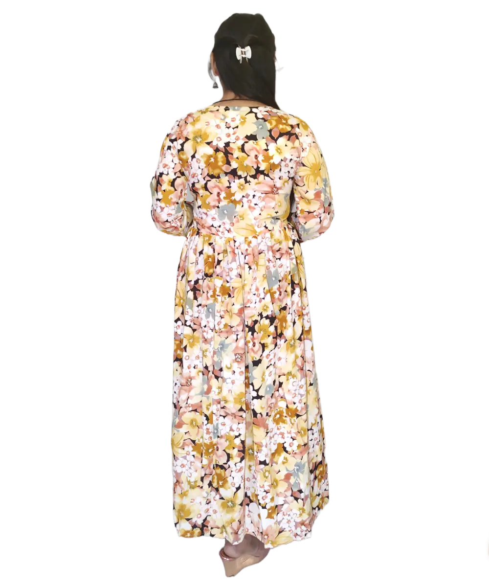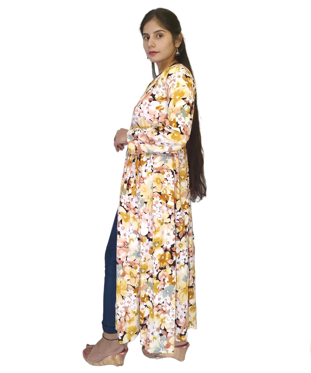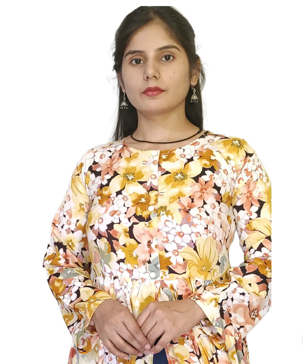 A-line floral print and front slit yellow dress will make you look very beautiful. you can also pair it with jeans, leggings and things.