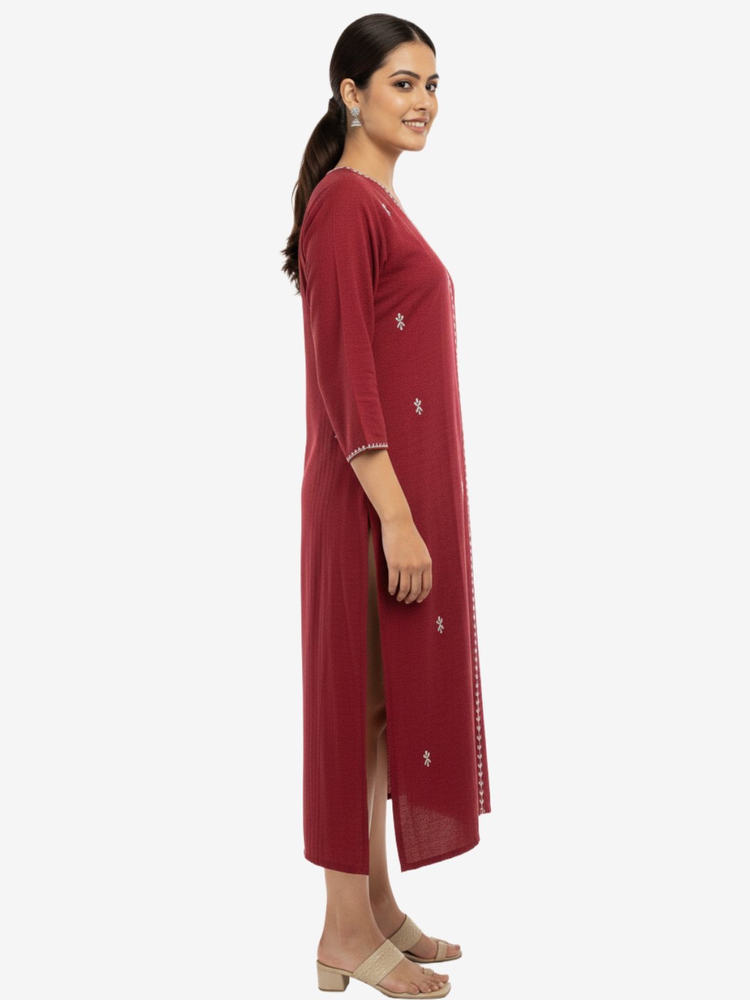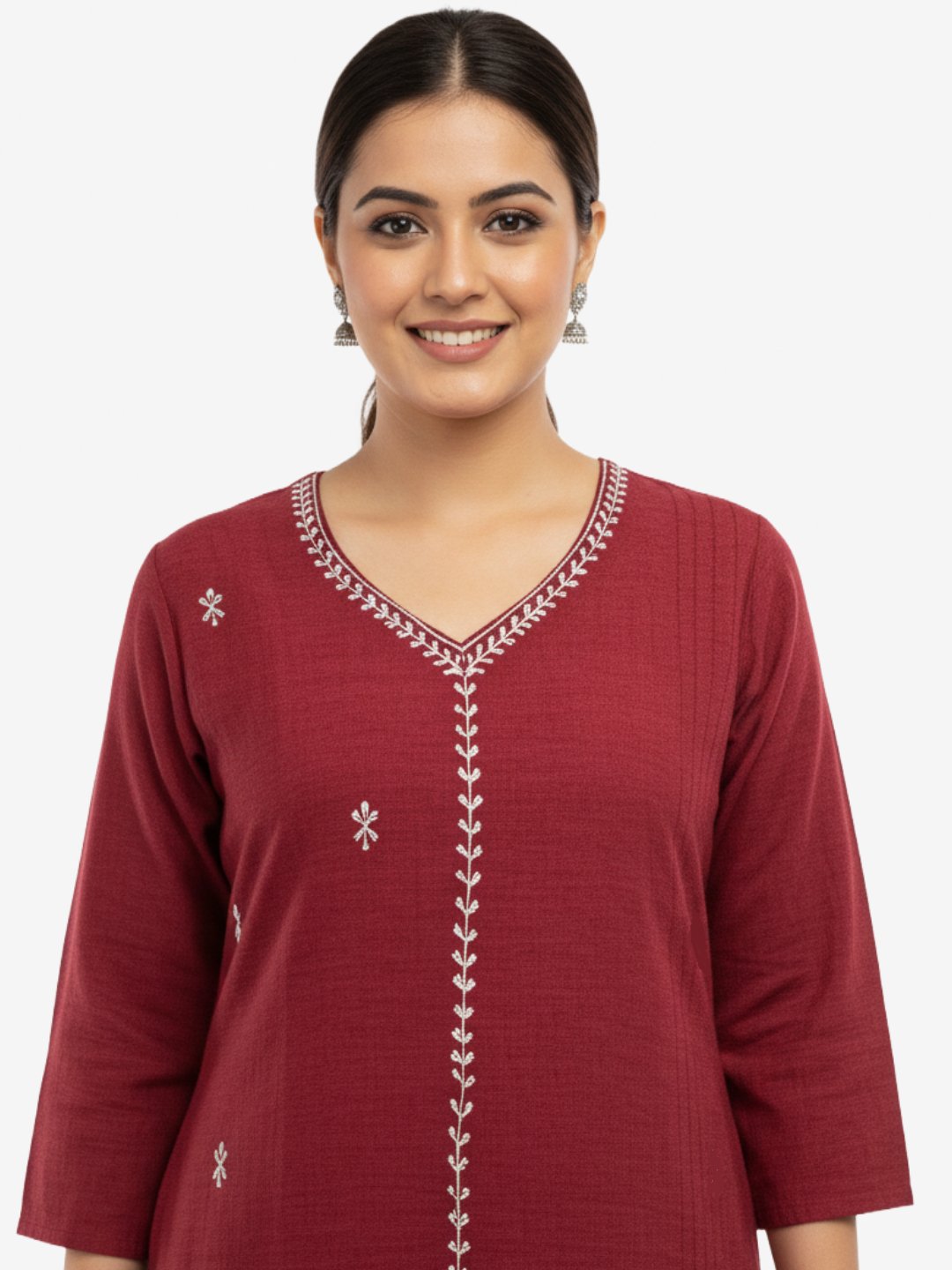 The solid deep maroon base is beautifully enhanced with delicate thread embroidery along the front panel and subtle motifs scattered across the body, adding a touch of understated sophistication. Featuring a flattering V-neckline and three-quarter sleeves, this straight-fit kurta provides a graceful silhouette suitable for both casual and semi-formal occasions.