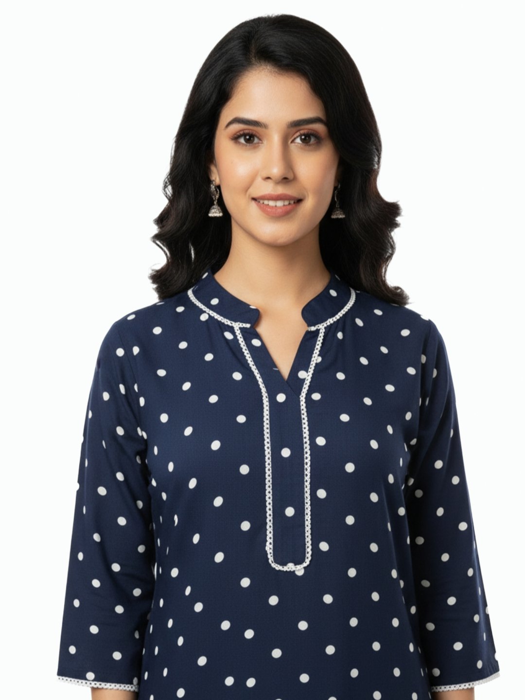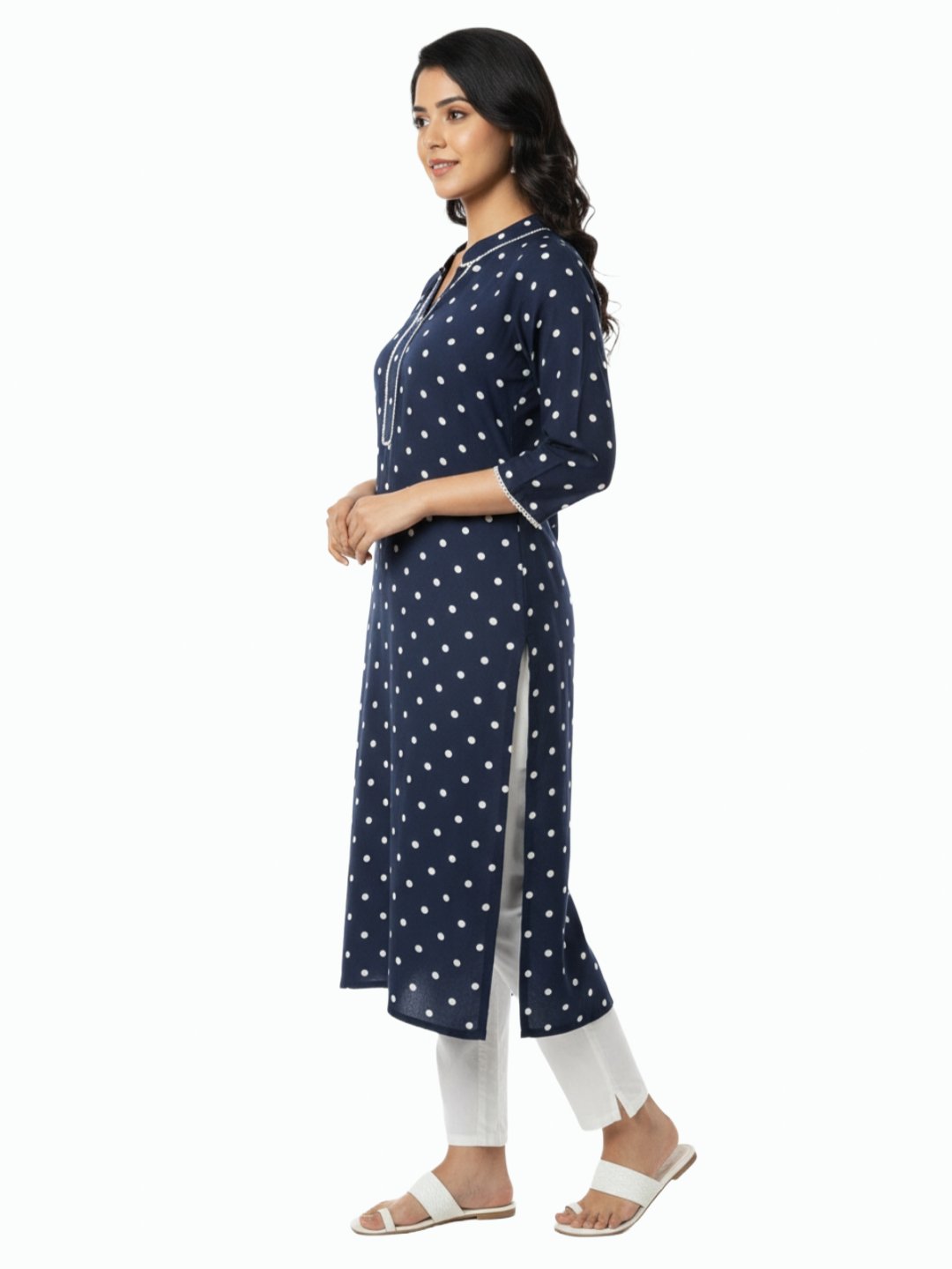 Effortlessly stylish and comfortable, this navy blue printed kurta is a wardrobe essential for modern women. Featuring elegant white polka dots all over, this kurta is crafted from soft, breathable fabric that ensures all-day comfort. The straight cut, three-quarter sleeves, and side slits offer a flattering silhouette, while the classic round neckline with a split V and delicate piping adds a touch of understated elegance. Pair it with white leggings or pants for a chic ethnic look that’s perfect for both casual outings and office wear.
