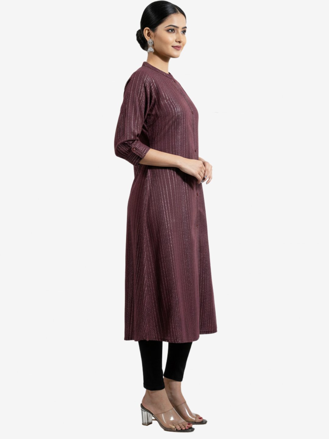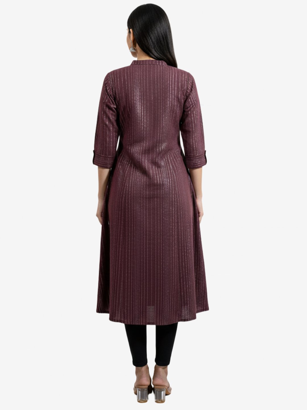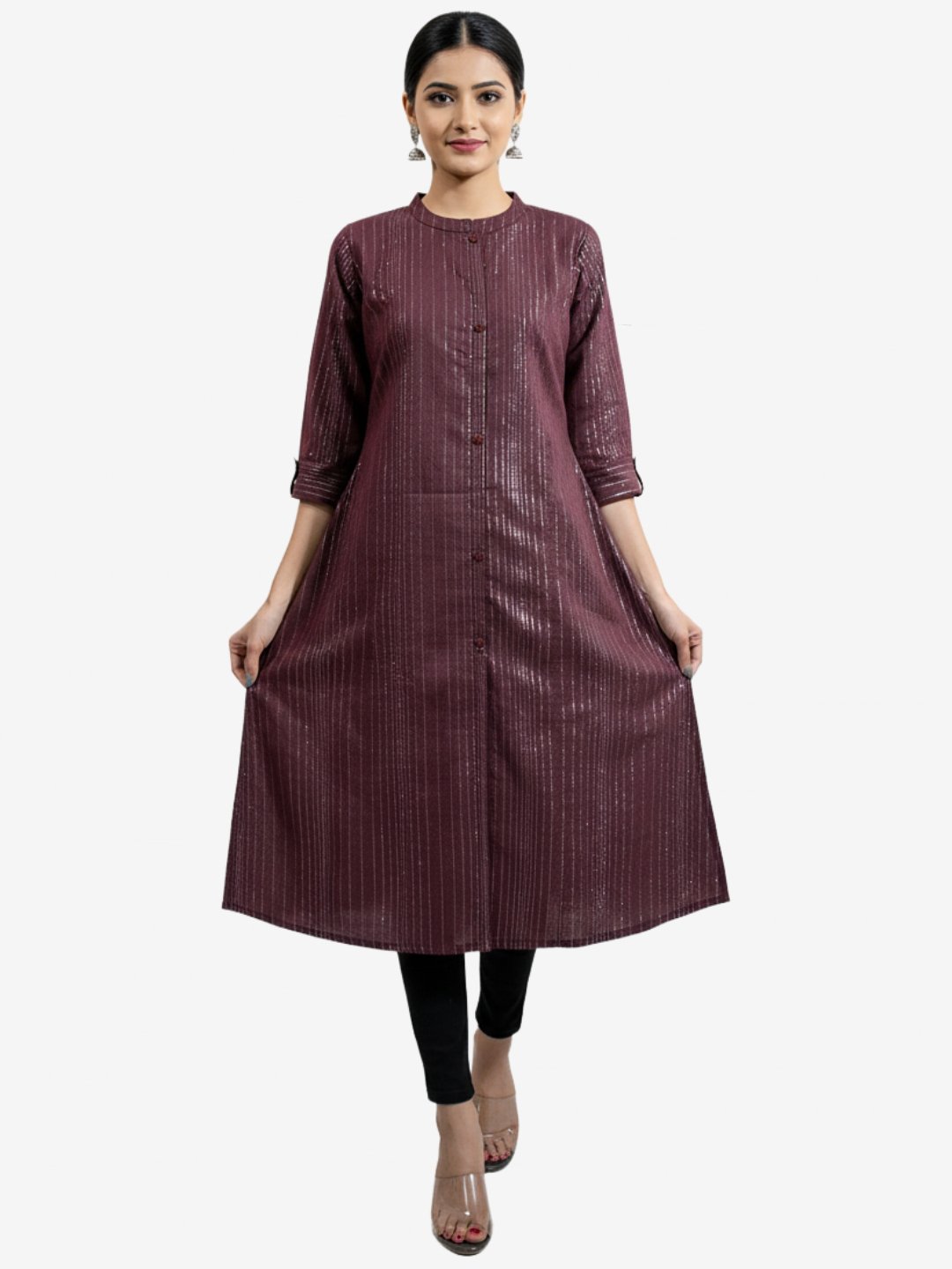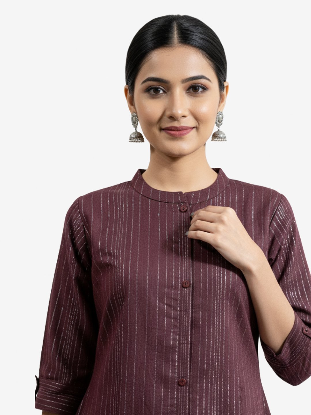 Make a sophisticated statement with this stunning Maroon Sequin-Striped A-Line Kurta. Designed with a flattering A-line silhouette, this kurta features a mandarin collar, full button-down front, and subtle shimmering sequin stripes that add a festive yet elegant touch. The three-quarter sleeves with roll-up tabs offer versatile styling, while the rich maroon shade makes it perfect for festive occasions, parties, and semi-formal gatherings. Pair it with leggings, palazzos, or trousers to complete a refined ethnic or Indo-western look.