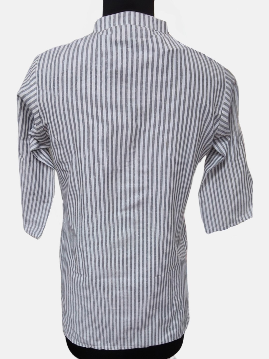 Elevate your everyday style with this charming striped cotton kurti, designed for ultimate comfort and effortless elegance. Featuring a refreshing blend of gray, white, and lavender vertical stripes, this kurti brings a soft and feminine touch to your wardrobe. The mandarin collar and 3/4th flared sleeves offer a modern yet traditional look, while the front placket with delicate purple buttons adds subtle detail.