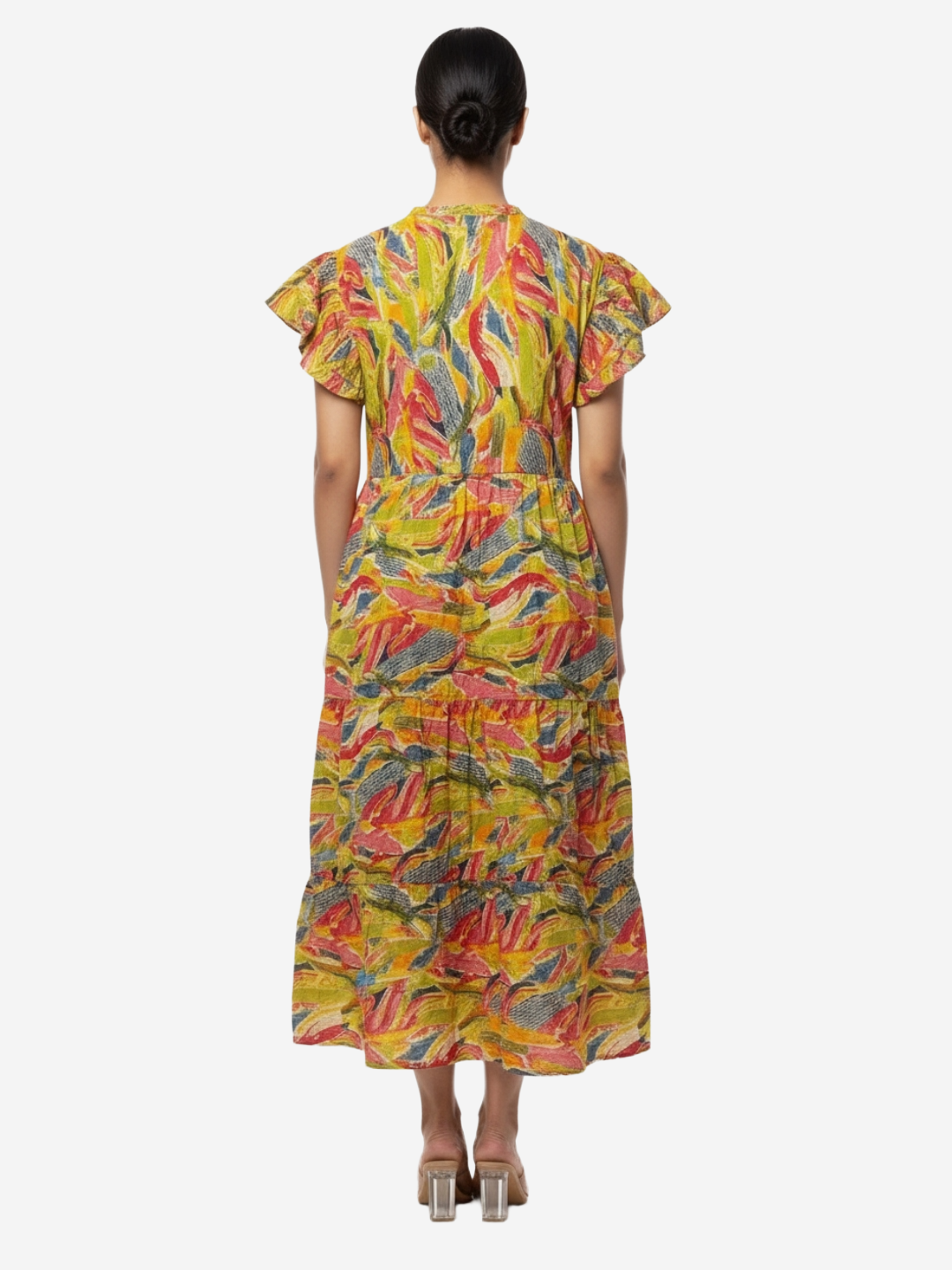 Abstract Print Yellow Flutter Sleeve Midi Dress